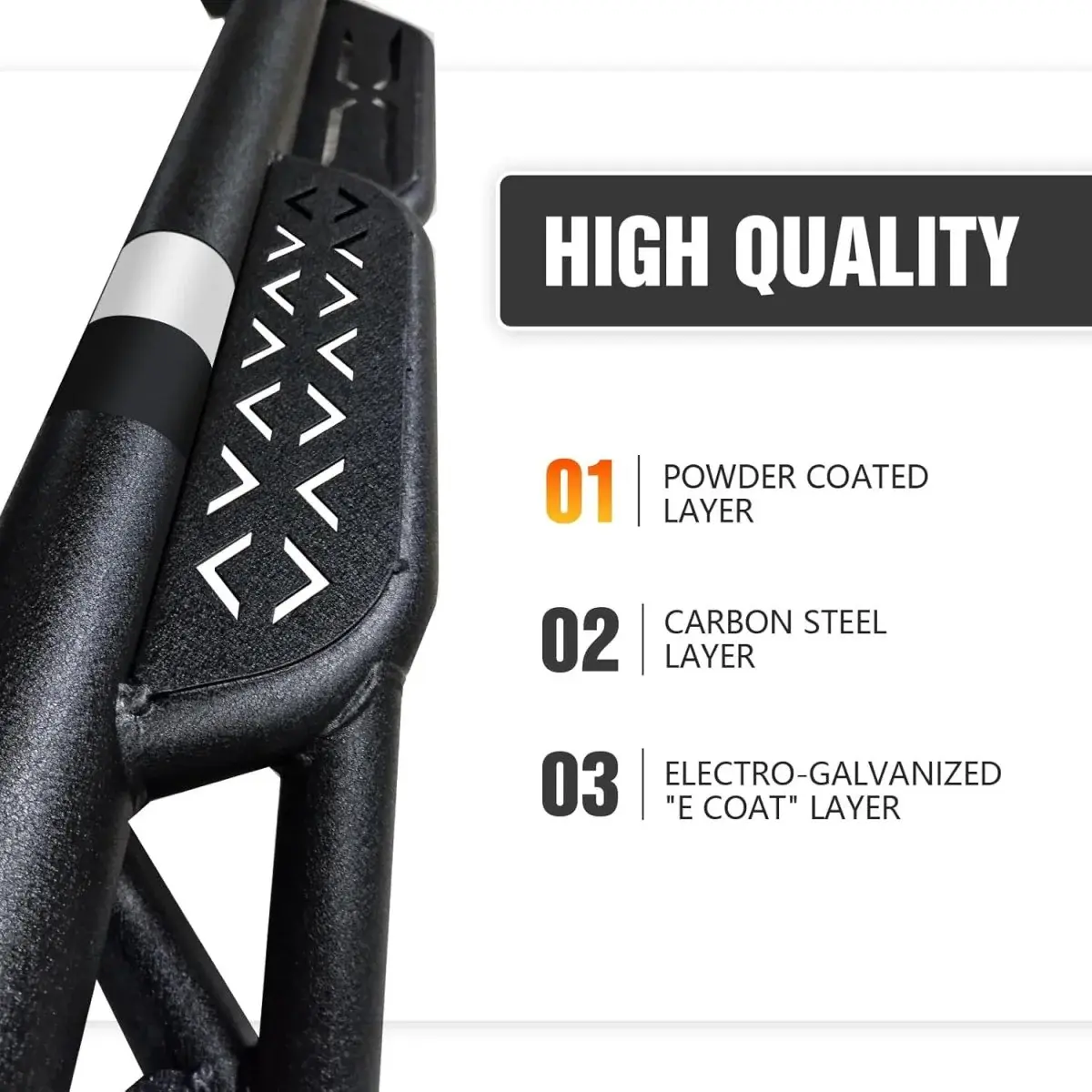 【Functional design】: ① The side step features a two-tier layout, providing enhanced convenience for vehicles with lift kits and oversized tires. It also facilitates easier roof access. ② The ultra-thick main tube imparts excellent weight-bearing capacity to the step, preventing deformation and offering enhanced vehicle protection. ③ Hollow design in the step area ensures secure and stable stepping, prevents water accumulation, and reduces driving resistance.