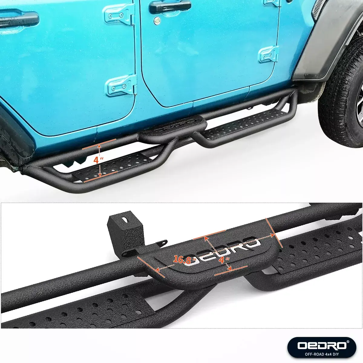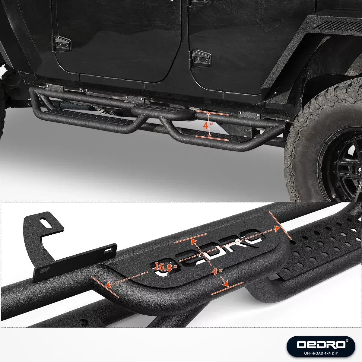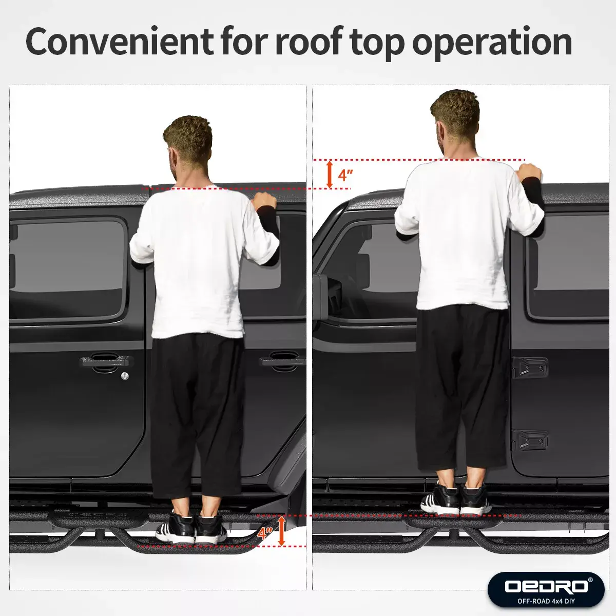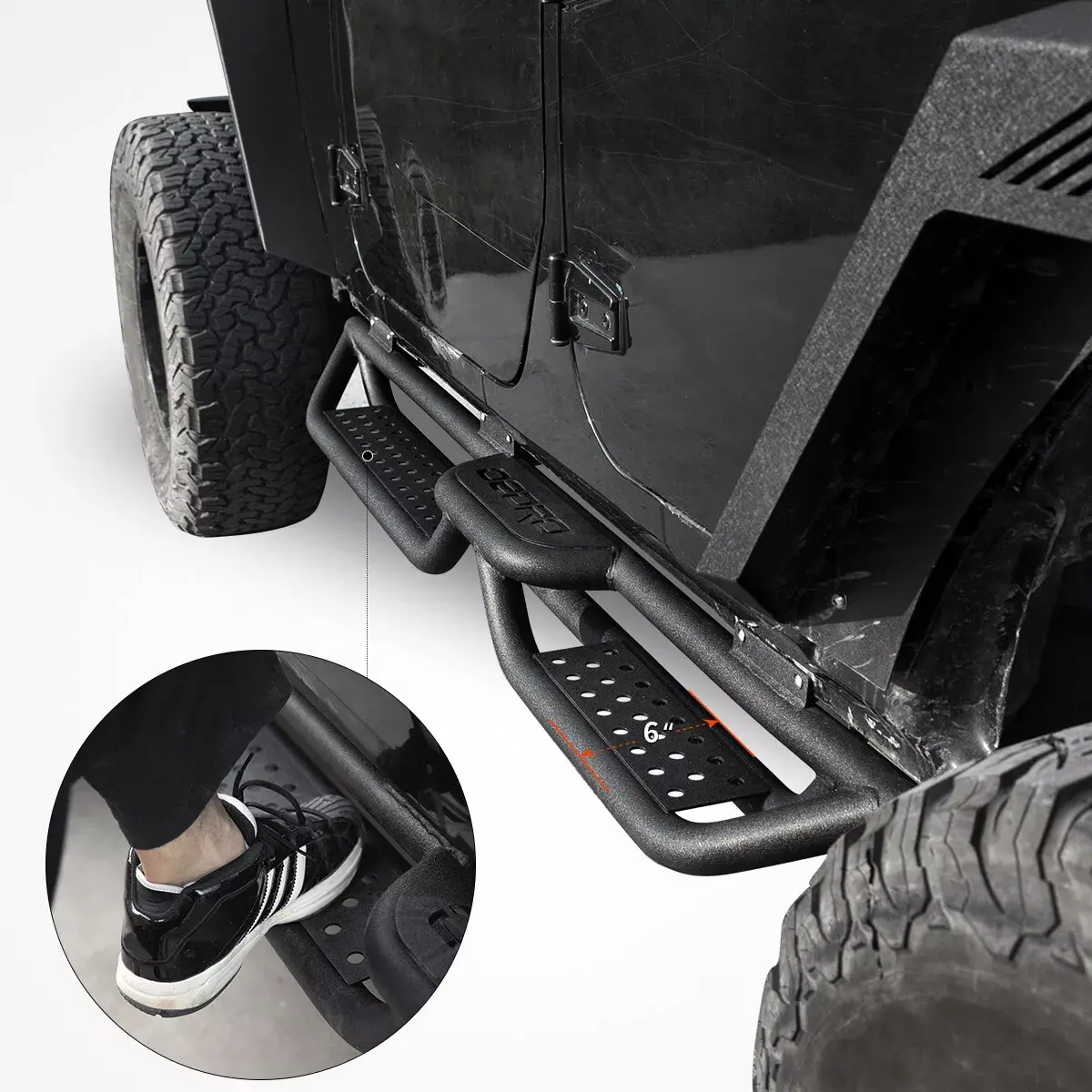 Functional Protection: ① 6inch side steps feature two-stair layout to provide better convenience for vehicles with lift kits and oversized wheel tires. Also allows for easier rooftop operation.② Three-tube design provides more protection for the bottom and the side of the car, also preventing from getting stuck on the rocker plate or hanging obstacles.