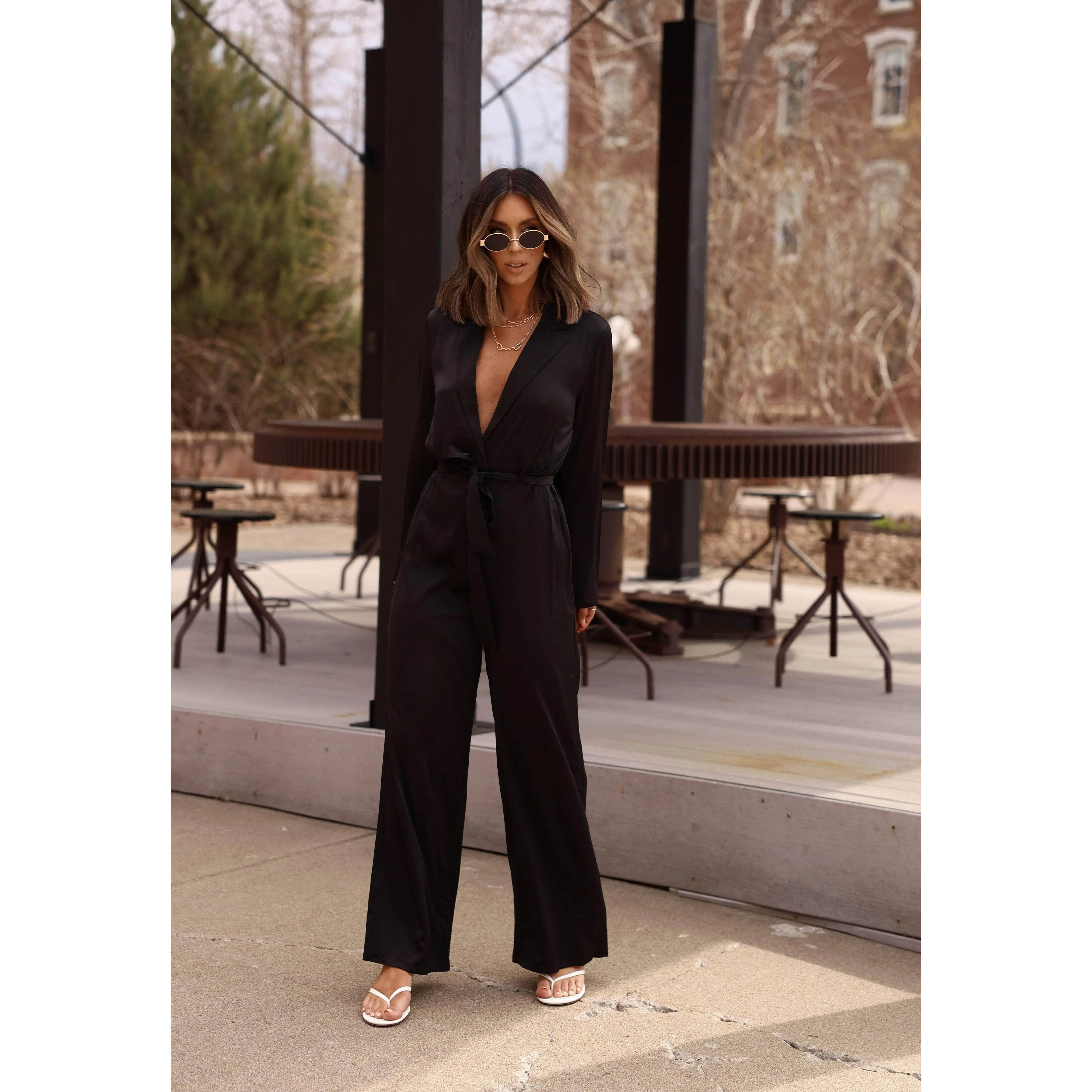 Look timelessly elegant in the Runway Moment Jumpsuit. Crafted in a luxurious satin fabric, this sophisticated piece features a v neckline, a waistline tie detail, wrap detail, a collared neckline, and snap closures for a classy look.