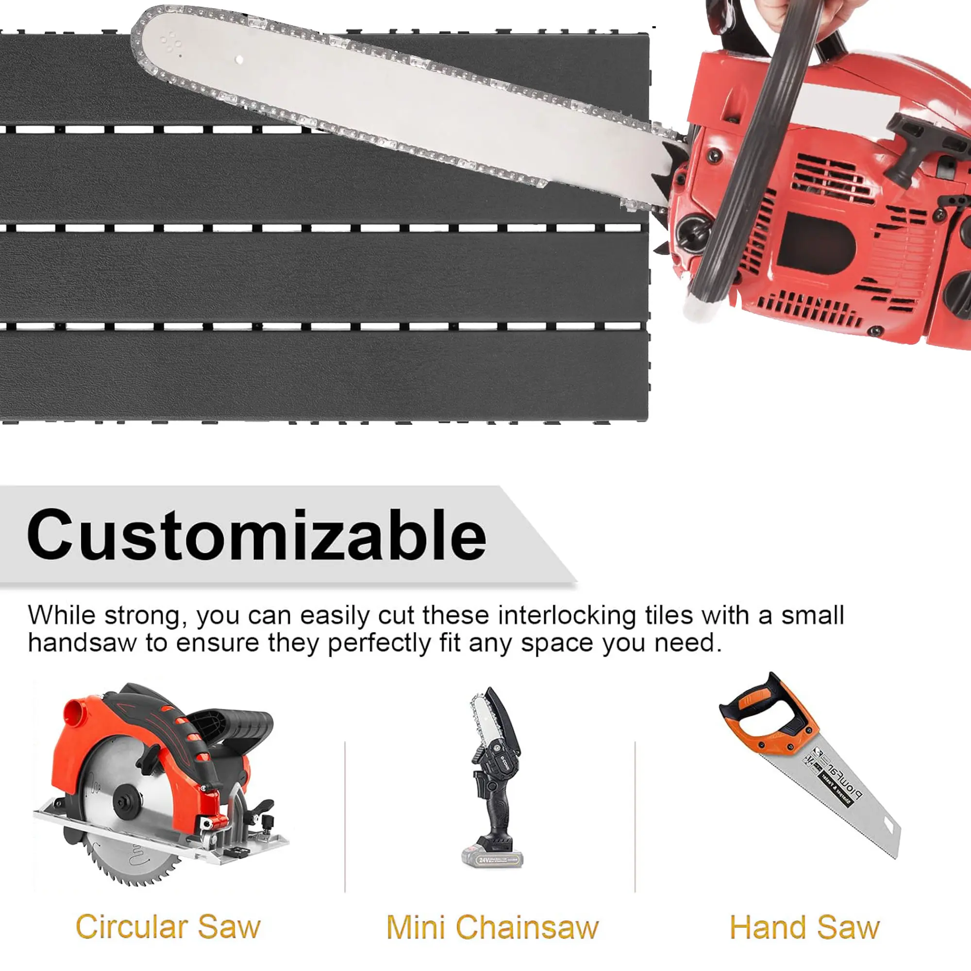 [Customizable & Versatile Use]Use a saw or other cutting tool to cut the plastic floors to the size you want.Fitting for putting this balcony deck tile in your patio deck, pools, garden, soft lawn, backyard, porch, outdoor playground, walkway and the other outside places.Or using in your bathroom, living room and the other indoor areas.