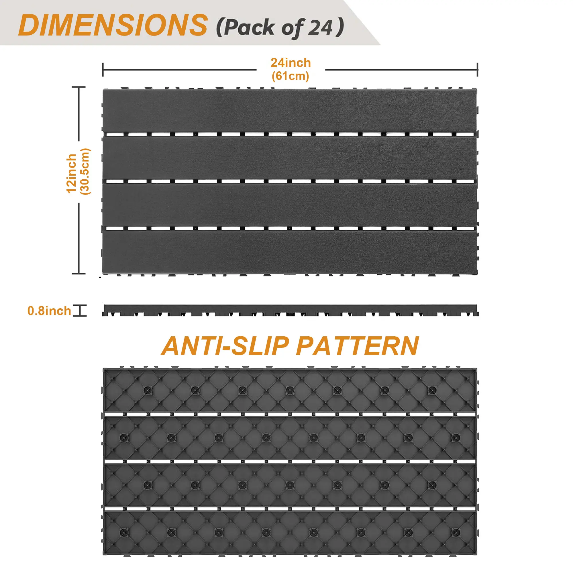[Size]Our flooring tiles are 24" x 12" x 0.8", so you don't have to worry about the thickness obstructing doors.A pack of 24 tiles covers an area of 48 sqft.