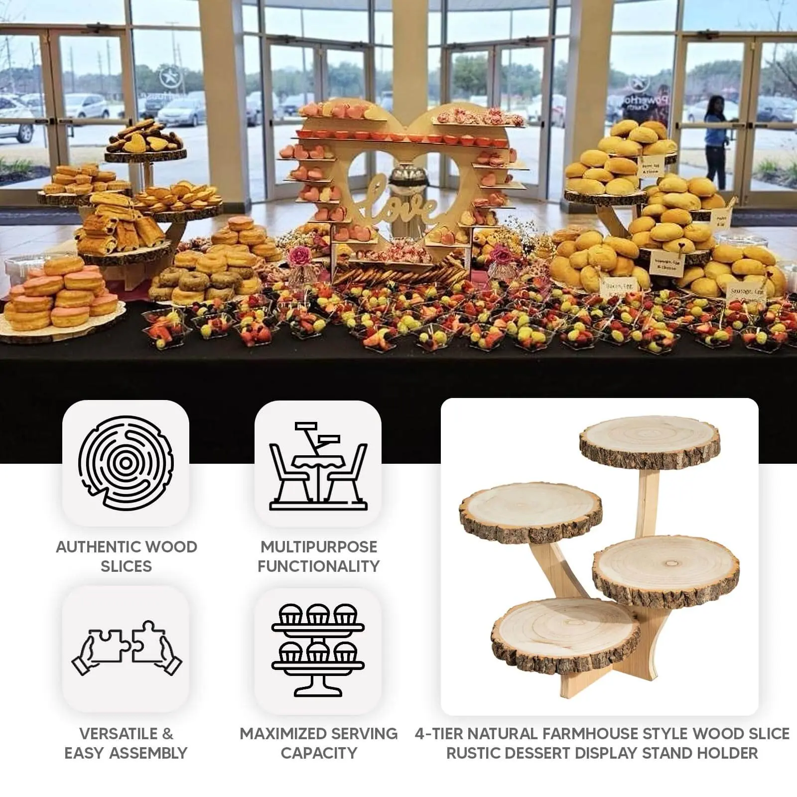 4-Tier Wooden Cupcake Stand Farmhouse Style Natural Wood Slice Design - Rustic Dessert Display Cake Holder 15" Tall