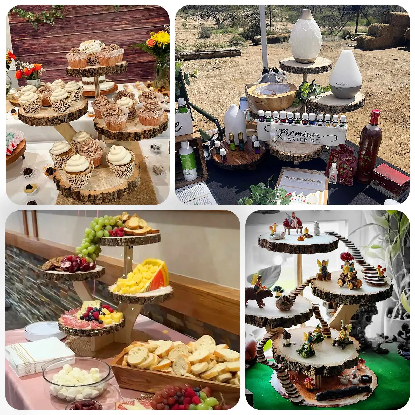 5. 4-Tier Wooden Cupcake Stand Farmhouse Style Natural Wood Slice Design - Rustic Dessert Display Cake Holder 15" Tall