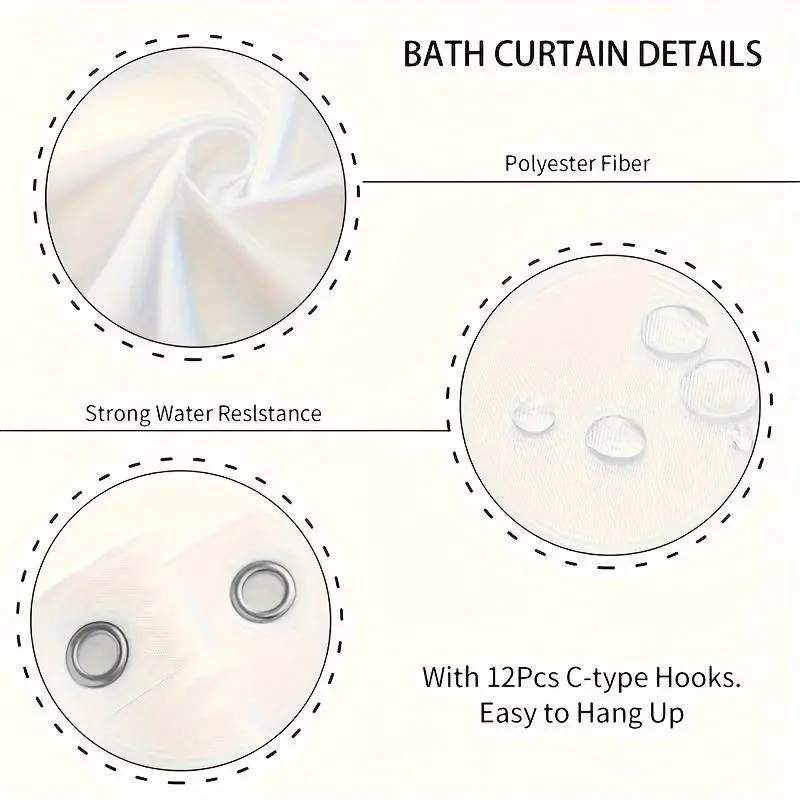 【Complete Set】: Includes 12 hooks, a shower curtain, toilet mat, bath mat, and toilet cover, providing everything needed for a coordinated bathroom look.