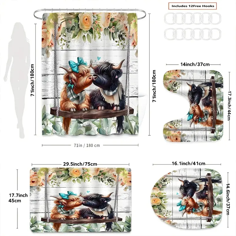 Bathroom Decor Set with Cow & Flower Pattern, Includes Hooks Curtain Toilet Lid Cover Bath Mat Rug, Rustic Style Bathroom Accessories, Shower Curtain Set
