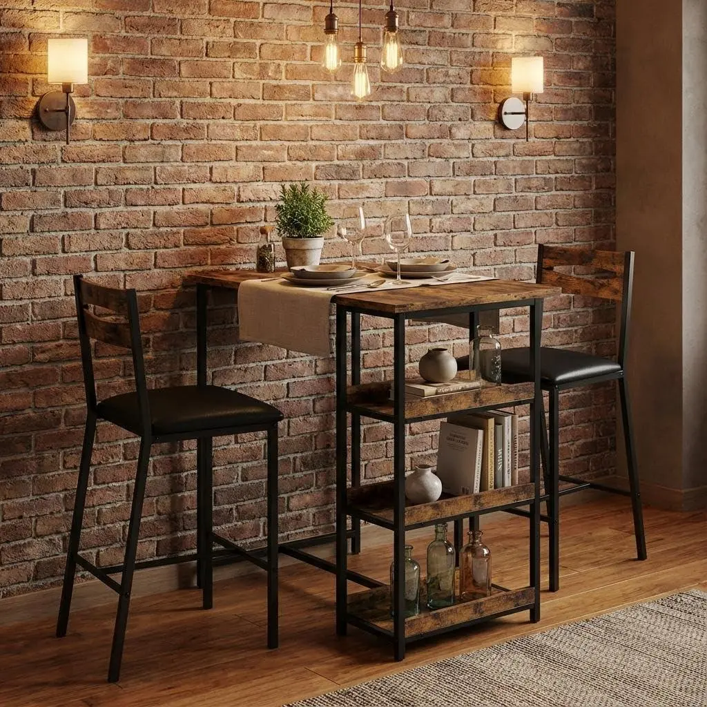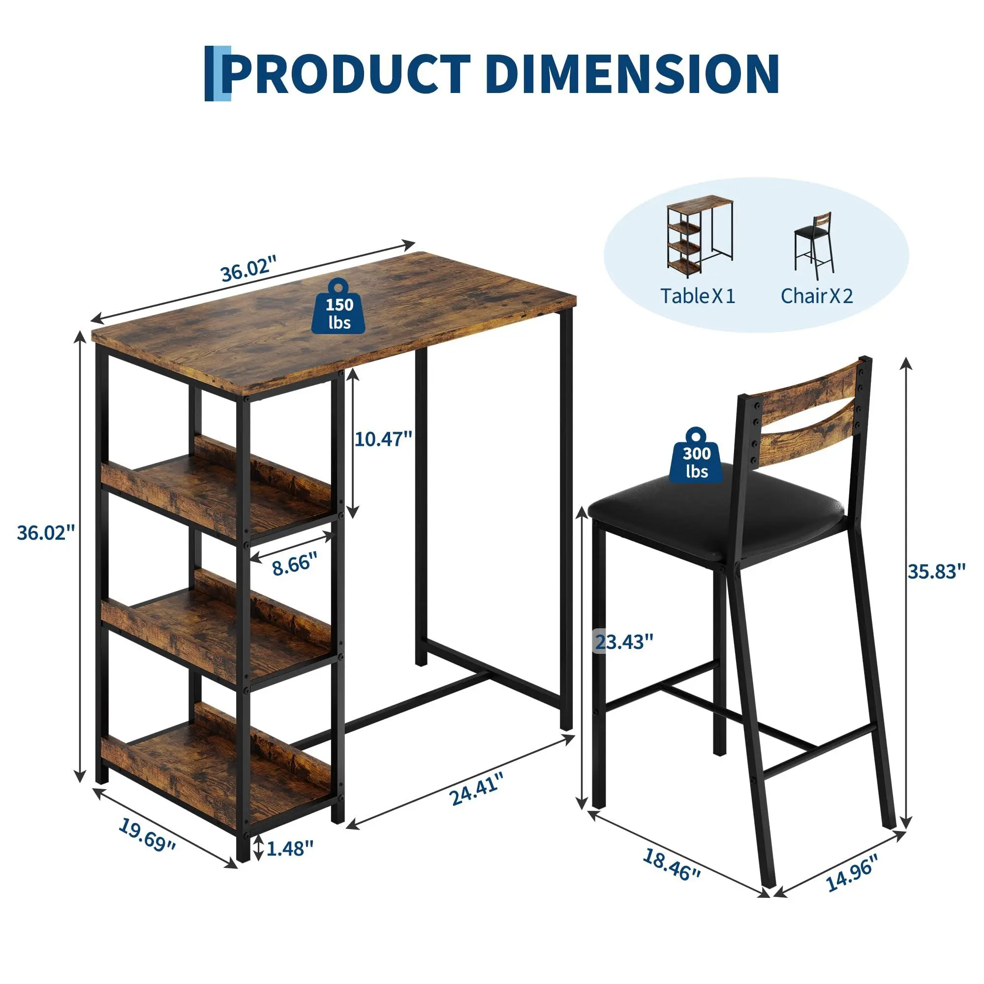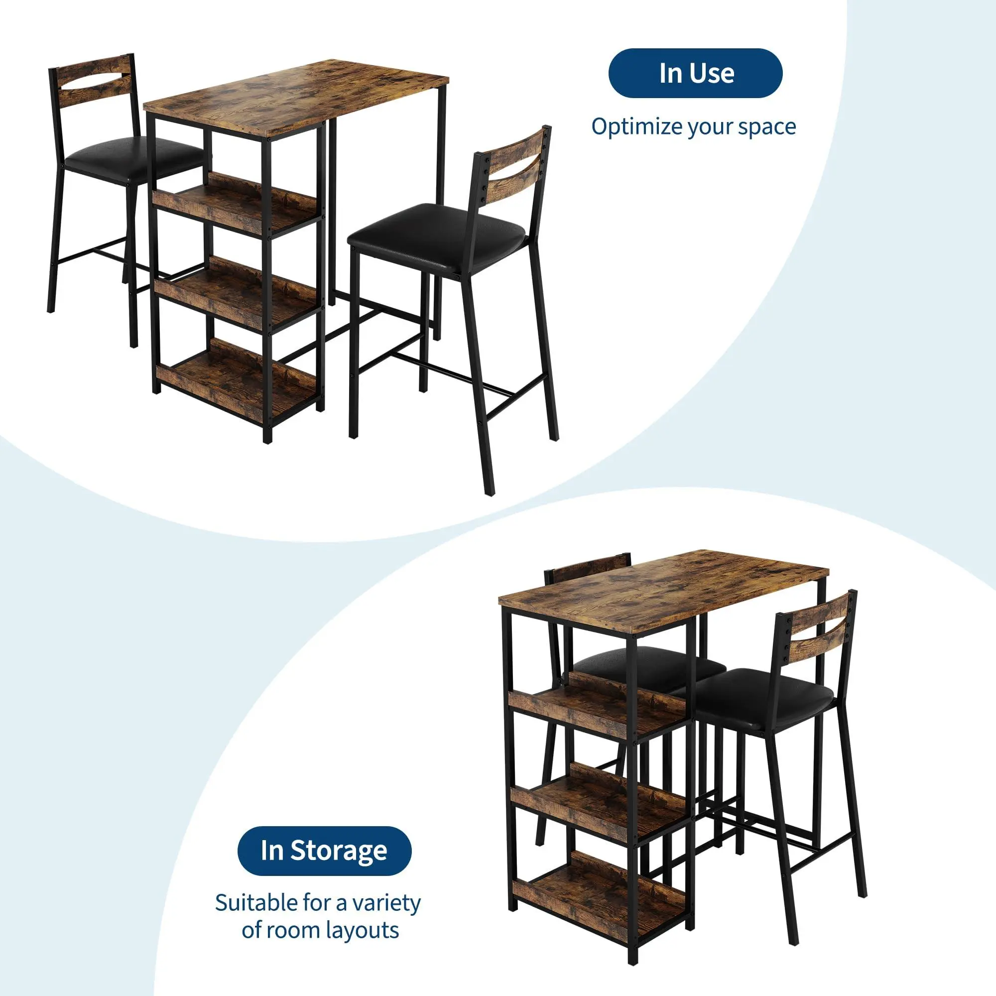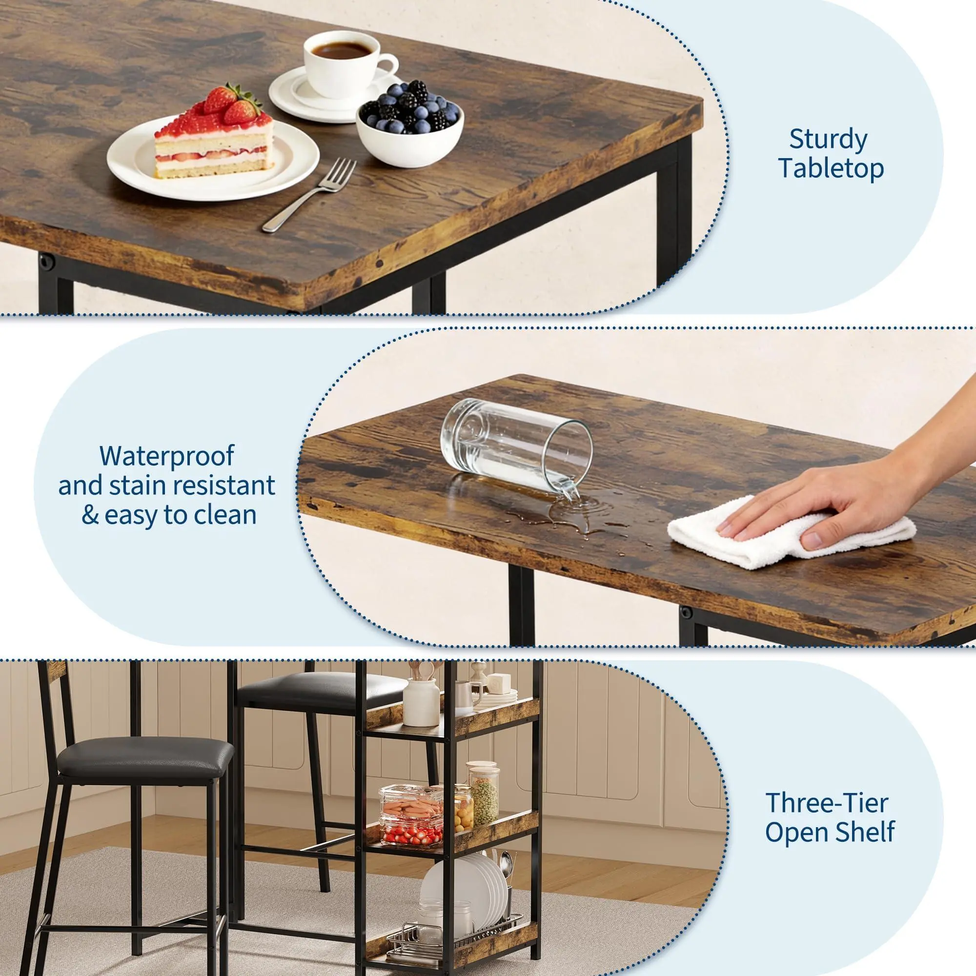 5. Rustic Brown 36" Counter Height Dining Table Set for 2 with Upholstered Bar Chairs and Storage Shelves, Space-Saving Kitchen Table for Small Space, Apartment, Studio