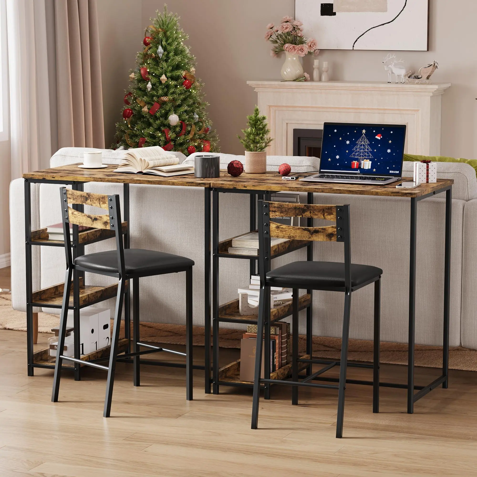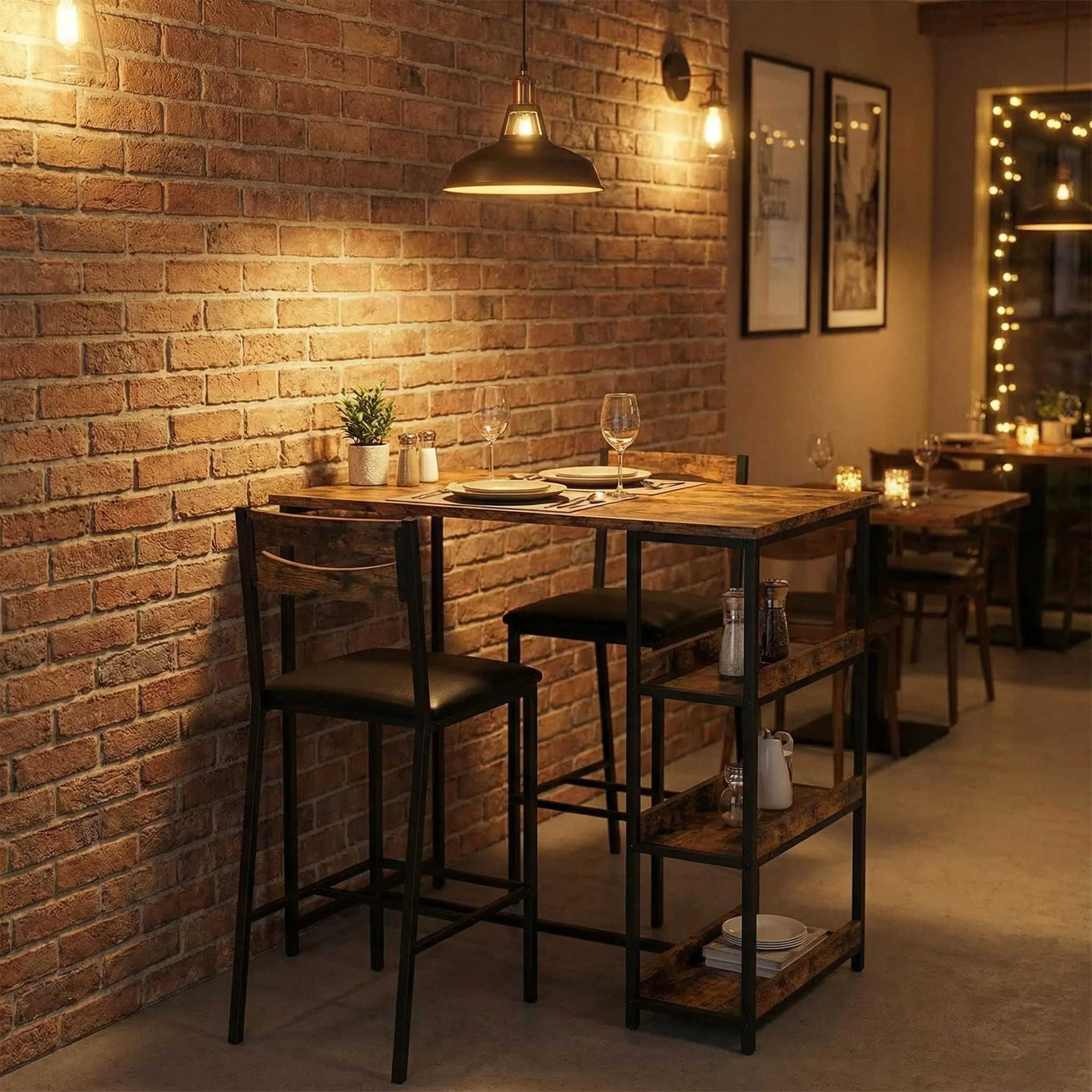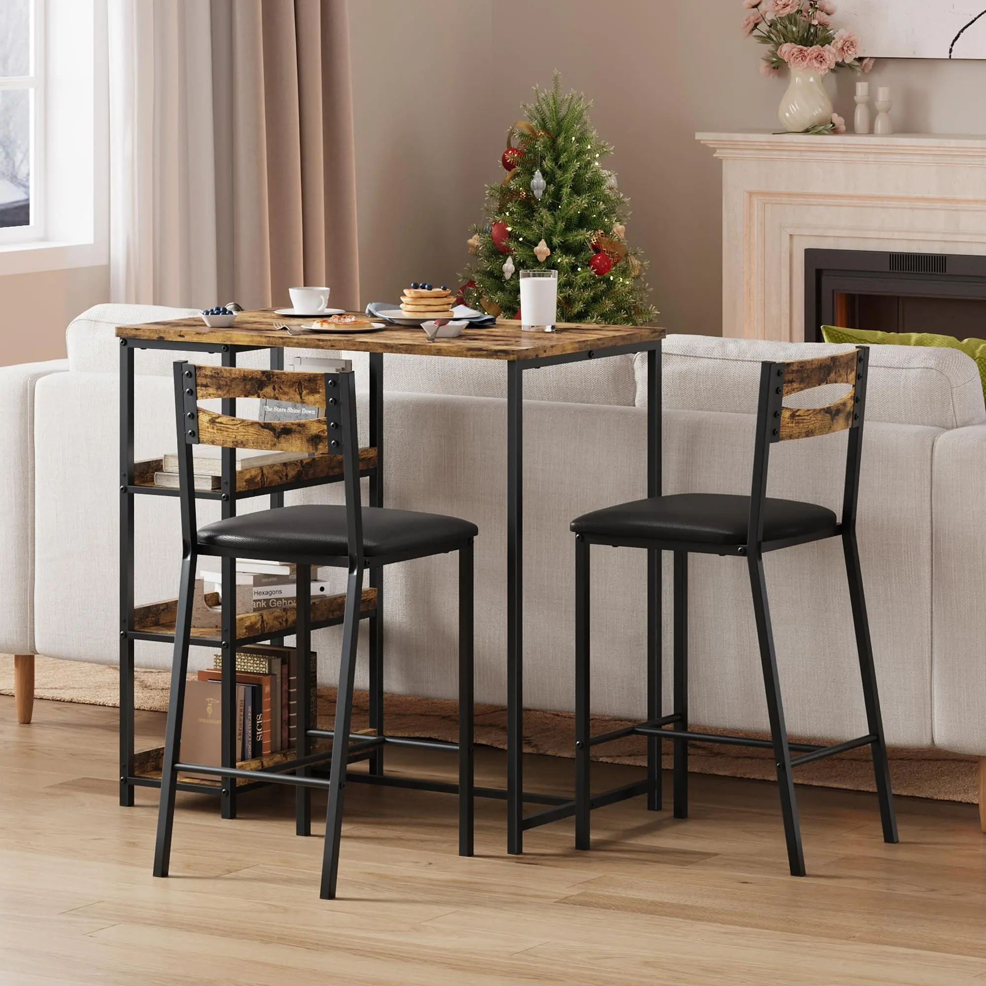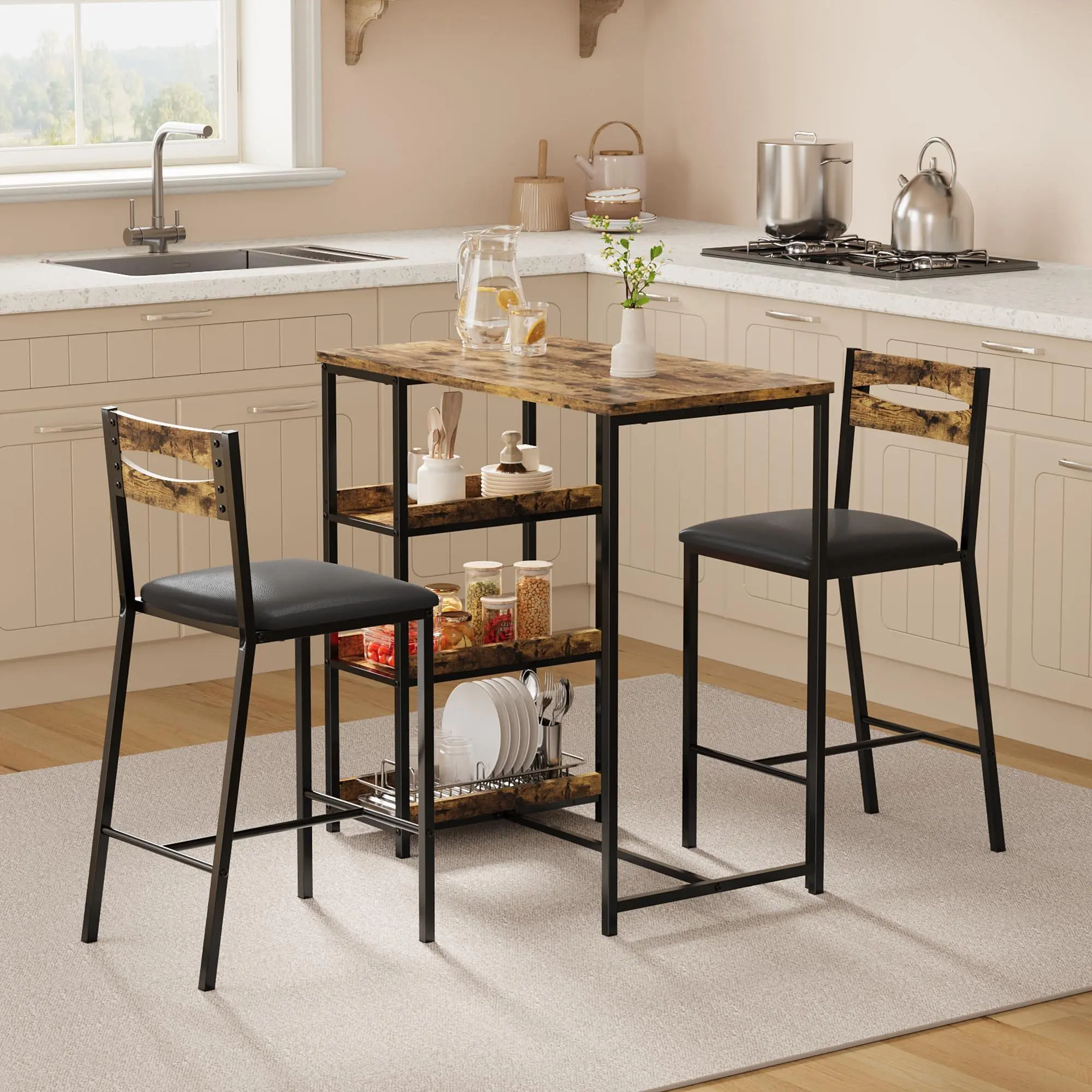 Rustic Brown 36" Counter Height Dining Table Set for 2 with Upholstered Bar Chairs and Storage Shelves, Space-Saving Kitchen Table for Small Space, Apartment, Studio