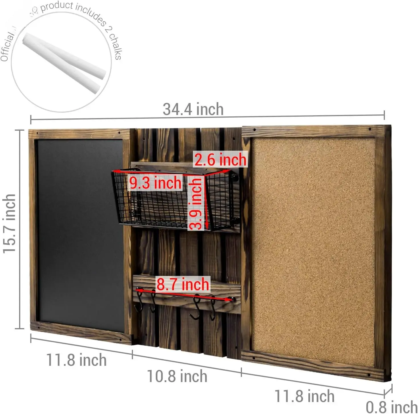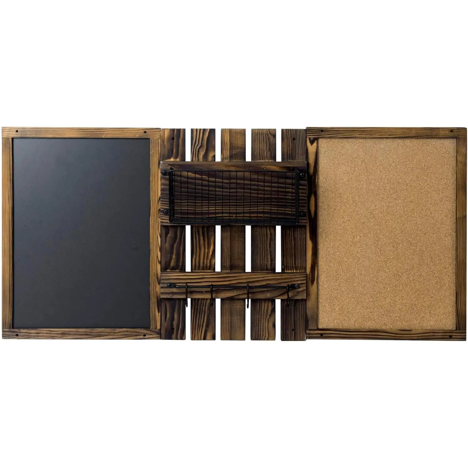 3 Panel Wall Mounted Entryway Bulletin Board Combo Set with Rustic Burnt Solid Frame with a Chalkboard, Cork Board, Black Metal Mail Basket, and Hanging Rail