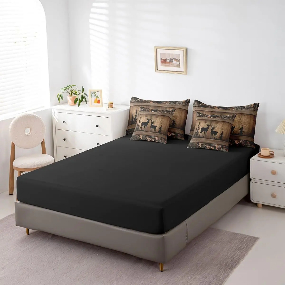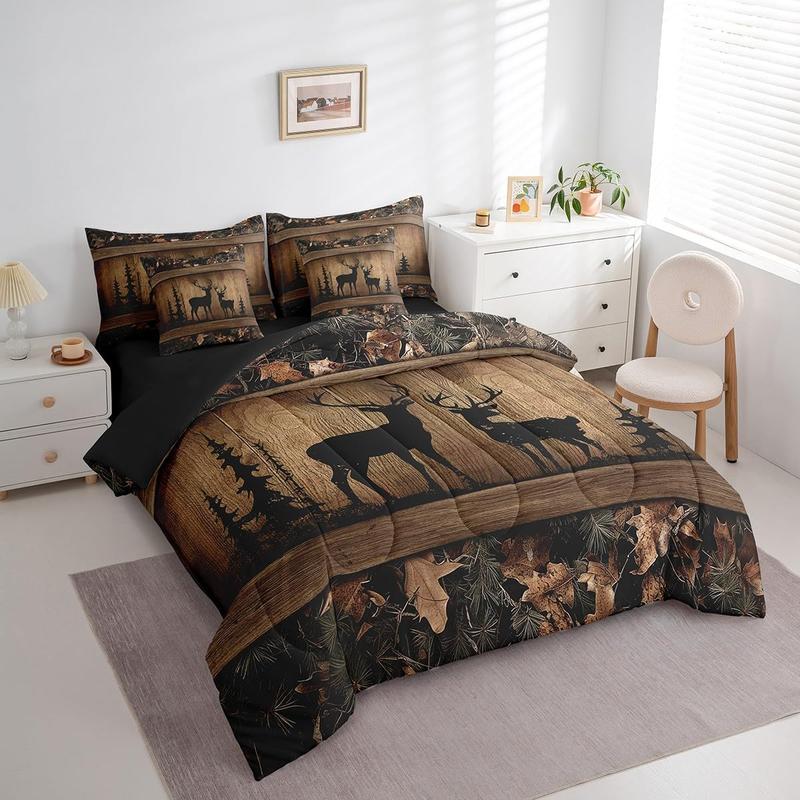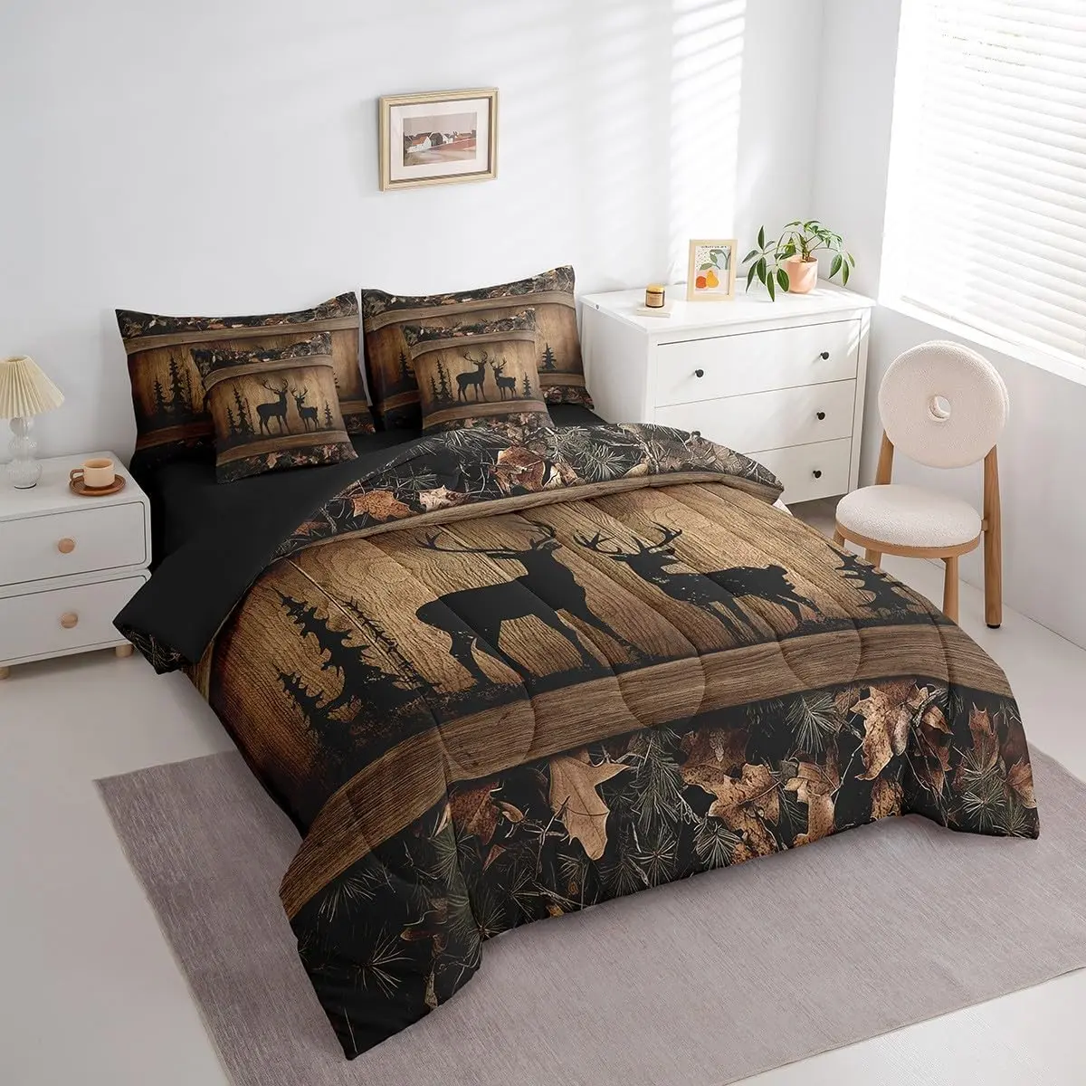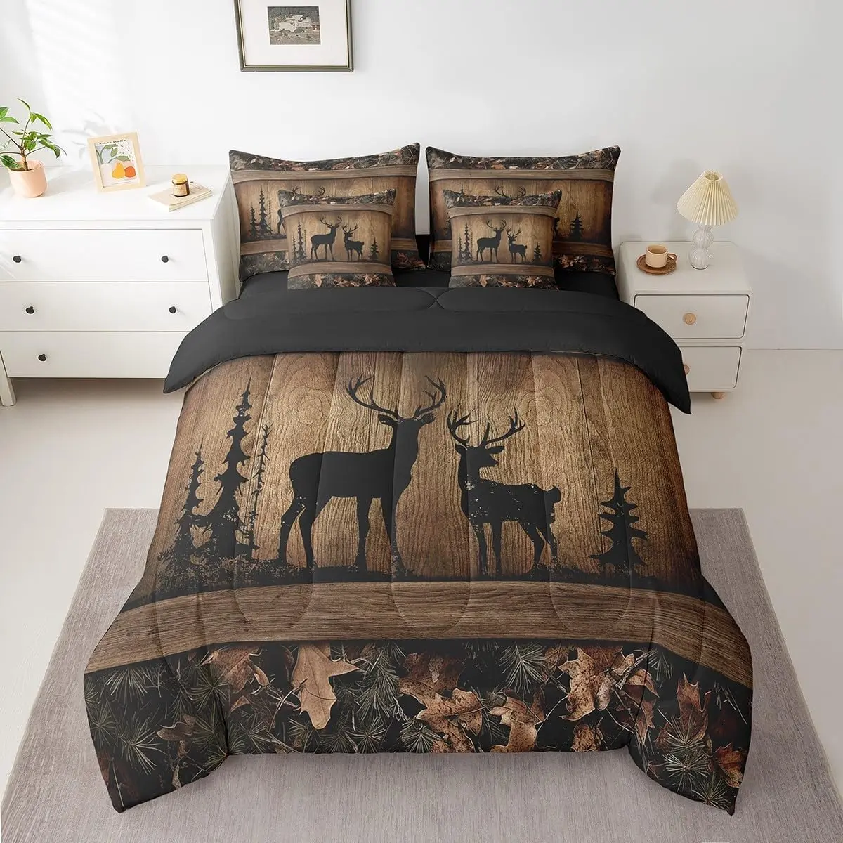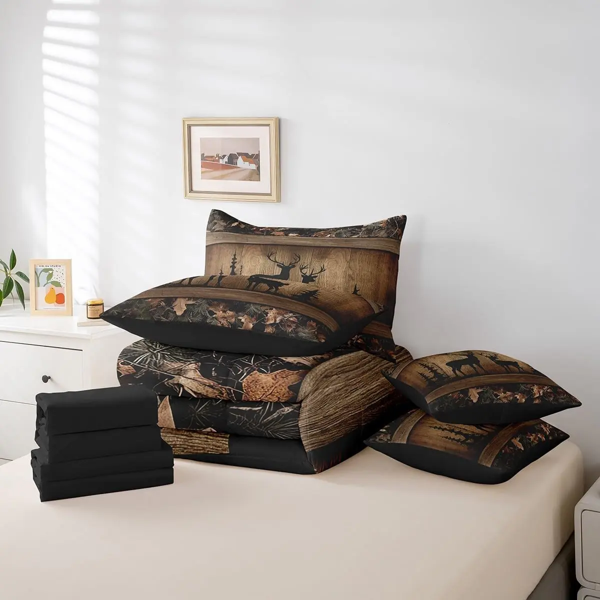Rustic Cabin Bedding Sets,7 Piece Camo Hunting Deer Comforter Set,Farmhouse Animal Bed in A Bag for Teen Men,Tree Camouflage Wildlife Sheet Set