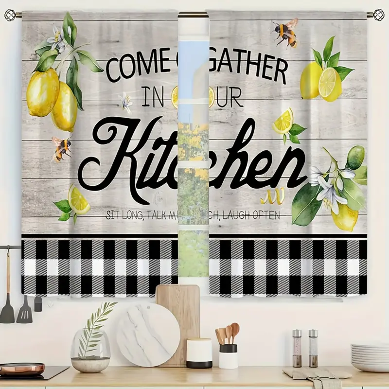 [Rustic Curtains] 2pcs Rustic Polyester Curtains | Lemon & Bee Design with Wood Grain Accents, Pole Pocket, Light-Filtering for Kitchen, Bedroom, Office, Living Room - Machine Washable high ceiling decor set inganchos custom drapery panel doble layer
