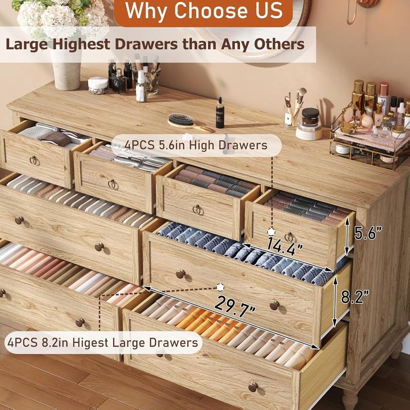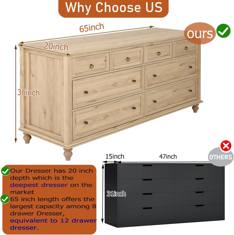 ·Large 8 Drawer Dresser with Deep Drawers: This 65" W * 20" D * 36" H dresser features 4 deep drawers (8.2" depth) and 4 standard drawers (5.6" depth), delivering exceptional storage capacity for effortless bedroom organization. Multi-sized compartments accommodate media collections, gaming gear, clothing, linens, and diverse storage needs.