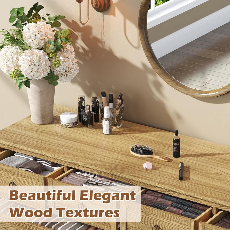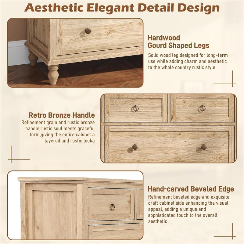 ·Rustic Elegant 8 Drawer Dresser: Crafted with premium solid wood veneer and genuine timber legs, each grain is meticulously sanded. Enhanced with vintage brass pulls, it exudes understated sophistication while infusing your bedroom with organic warmth.
