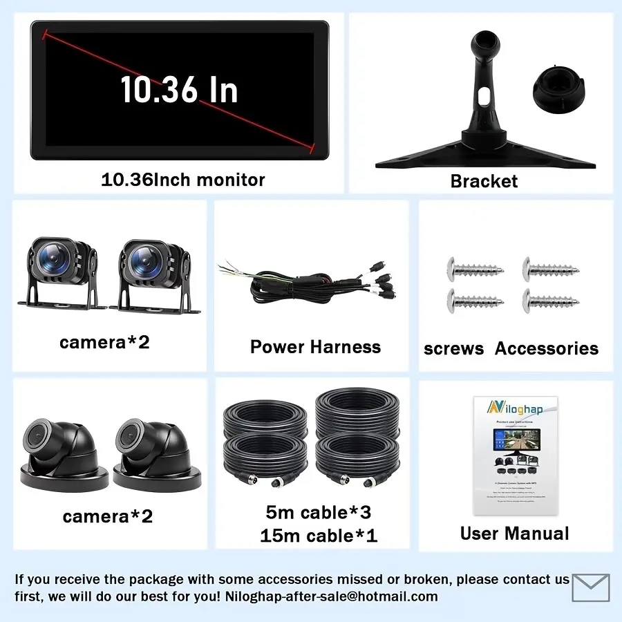 ·【Suitable for Various Vehicles】Monitor powered by cigarette lighter, monitor with adhesive (dashboard) or screw-on (overhead) mounting. 4 extra-long cables included, compatible with RVs, trucks, trailers, school buses, heavy-duty campers, Class A box trucks, semi-trucks, travel trailers, horse trailers, tractors, 5th wheels, etc.