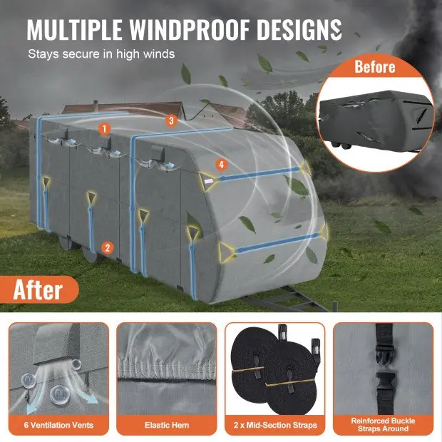 ·Windproof Fit: The bottom edge of the trailer cover is made with elastic bands. Comprehensive straps and ropes are provided: 2 middle binding straps, 4 side buckle straps, 4 front and rear buckle straps, and 4 tire cover fastening straps. This design allows the cover to hug the contours of your RV, maintaining its shape and enhancing wind resistance to prevent tearing or blowing off. Two sides of the cover are equipped with 3 ventilation ports to avoid bulging.