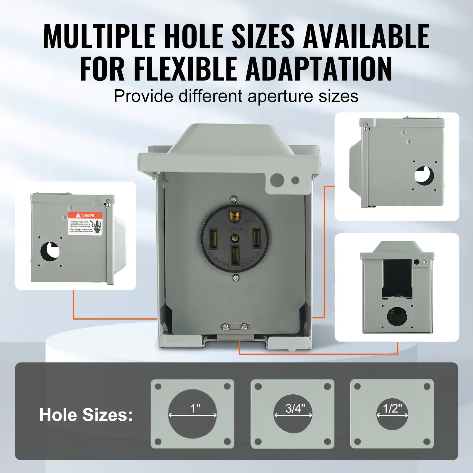 • High Compatibility: Our outdoor rv receptacle comes with pre-knocked holes and three different aperture sizes so that users can choose the appropriate size, ensuring a secure connection and providing more stable and reliable power access.
