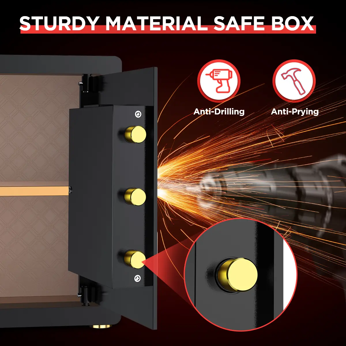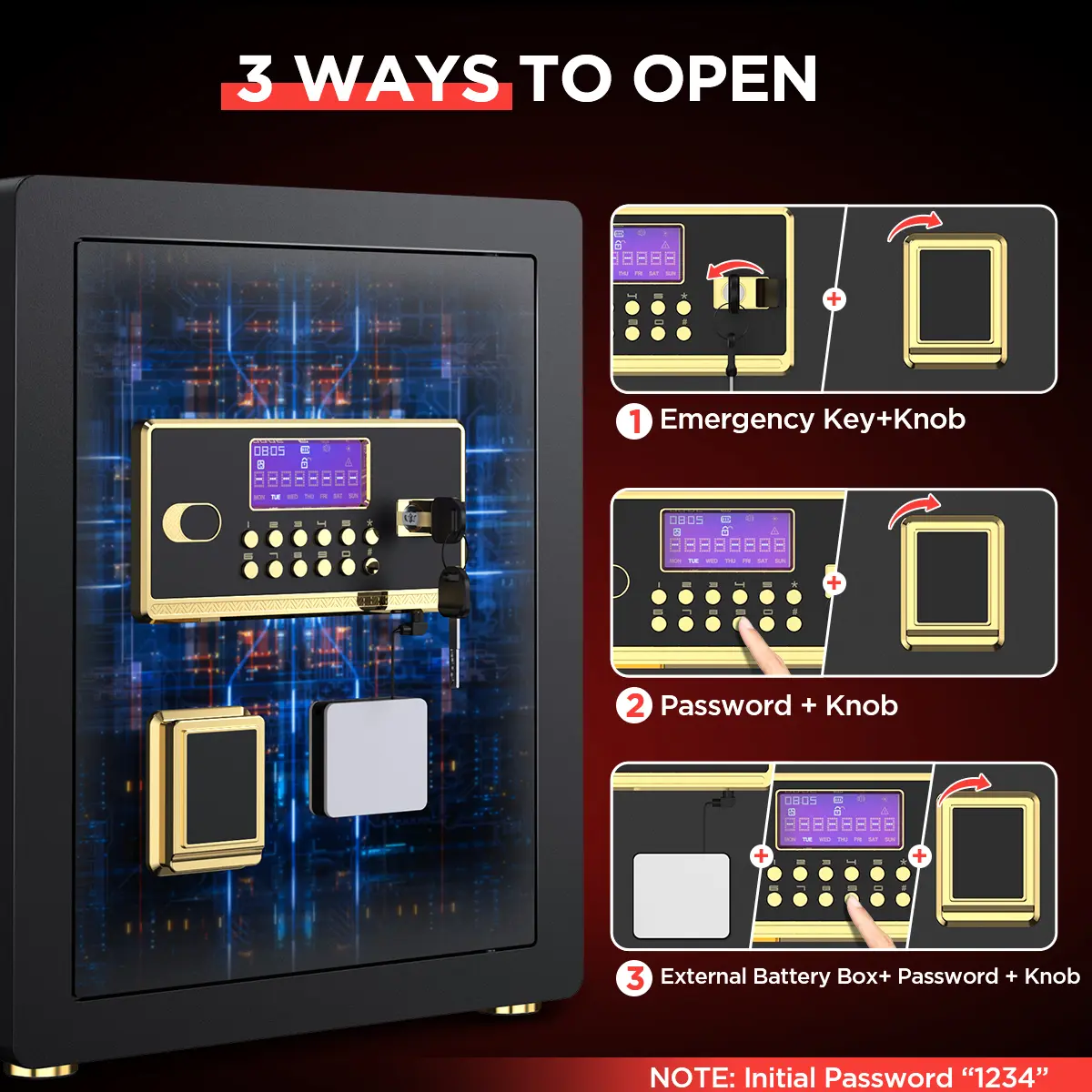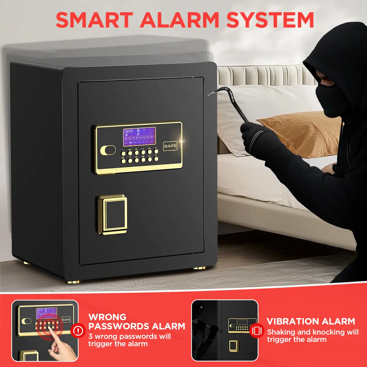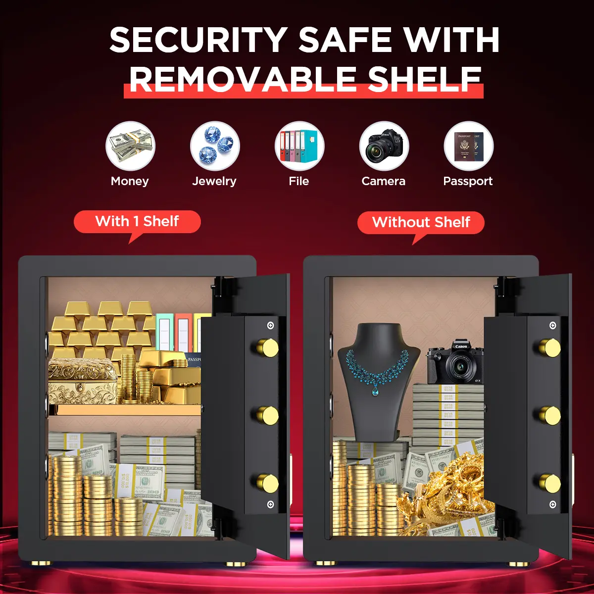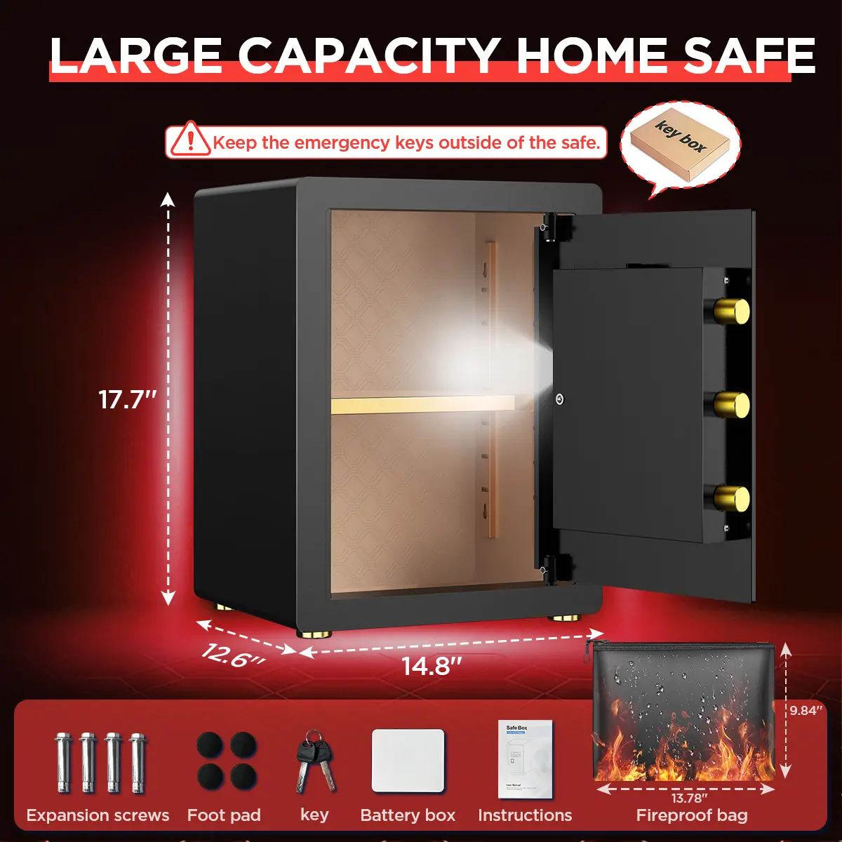 The safe is sturdy and a good weight. You can attach it to the wall so it can’t be easily stolen. It has an interior light as well. The only thing I don’t like about it is you have to use one key with the passcode.