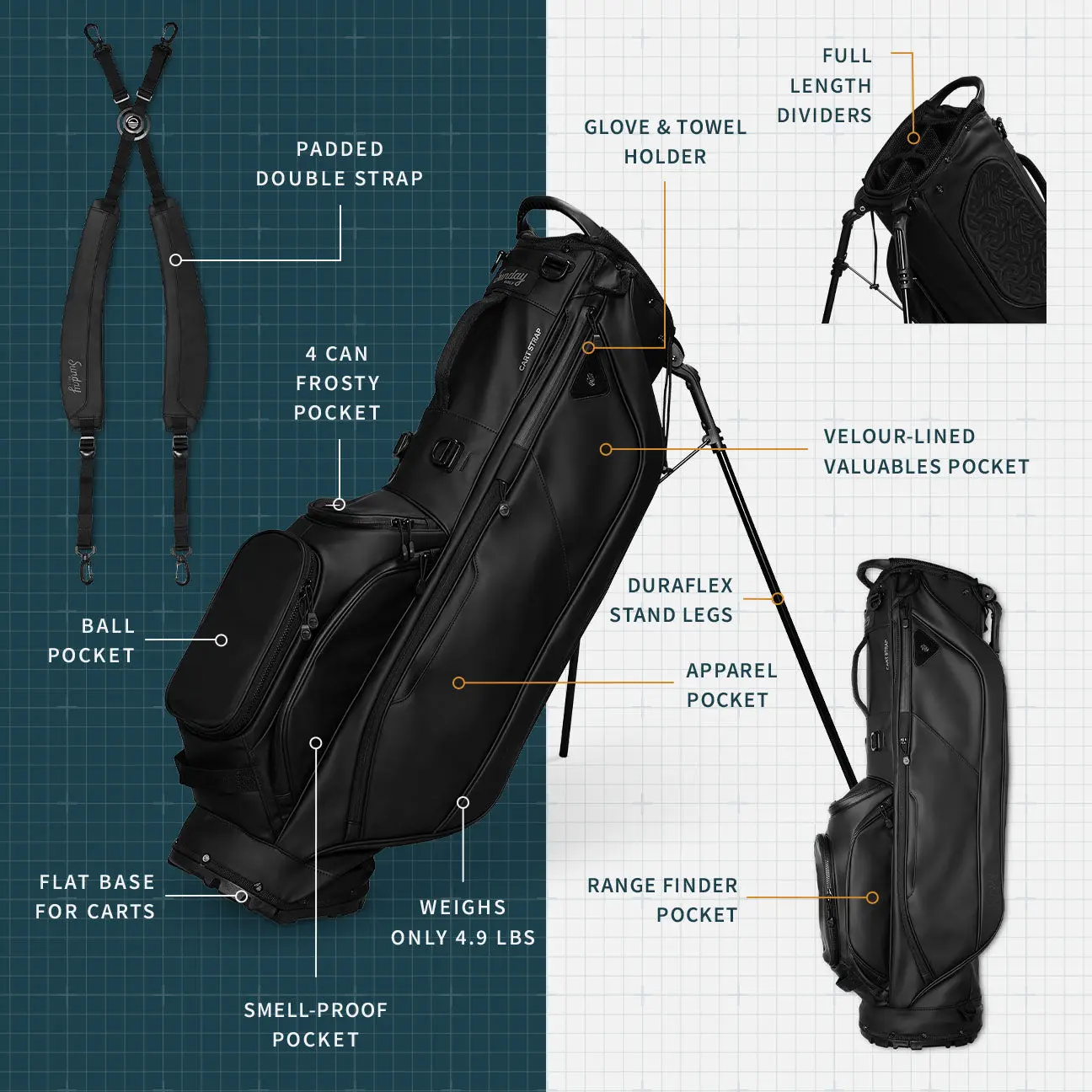 Introducing the Sunday Golf Ryder S-Class in Black—the James Bond of golf bags—sophisticated, smooth, and always ready to steal the show. For the golfer who likes their game like their coffee—bold and without any nonsense—this sleek sidekick is your go-to. Whether you’re hitting bombs or just dodging the rough, this bag’s got your back in serious style.