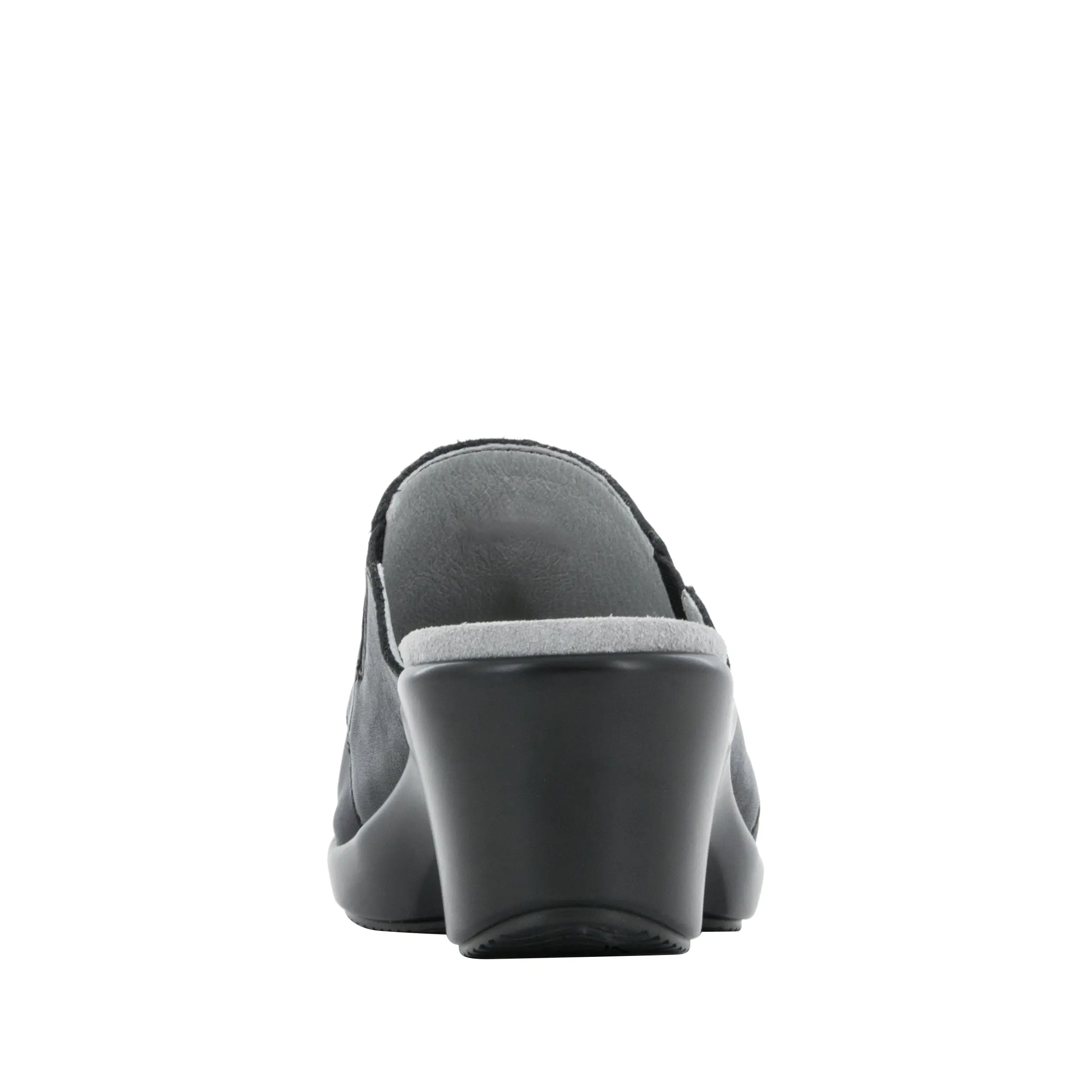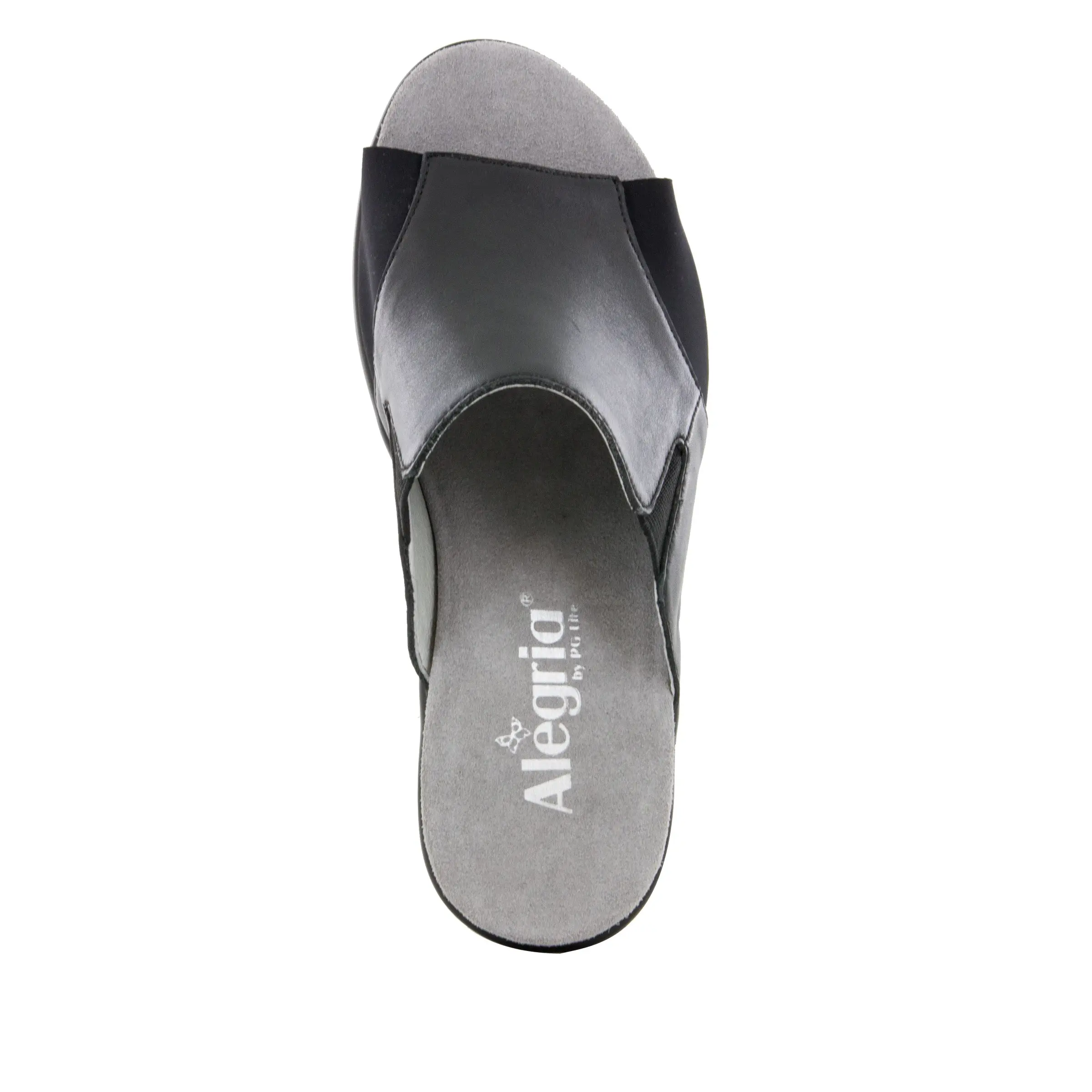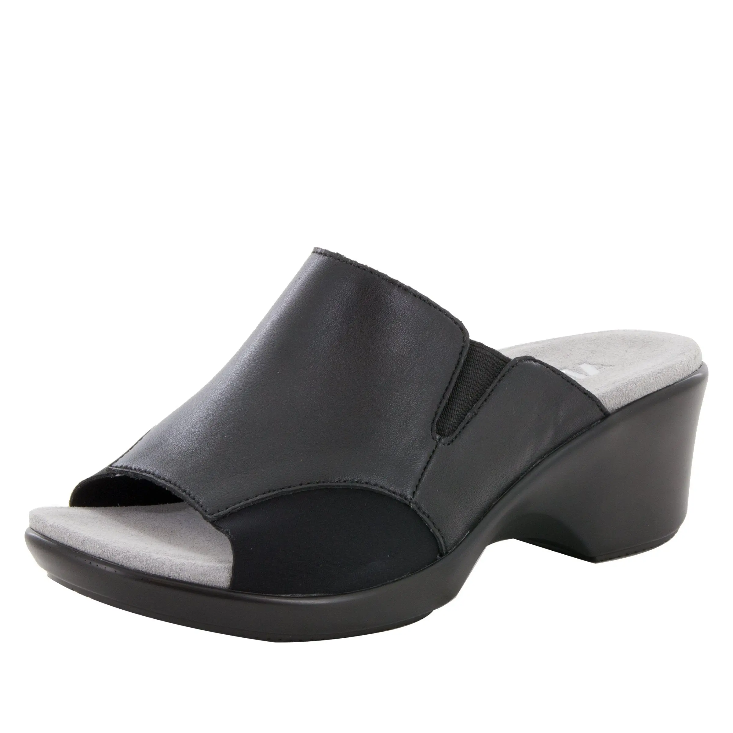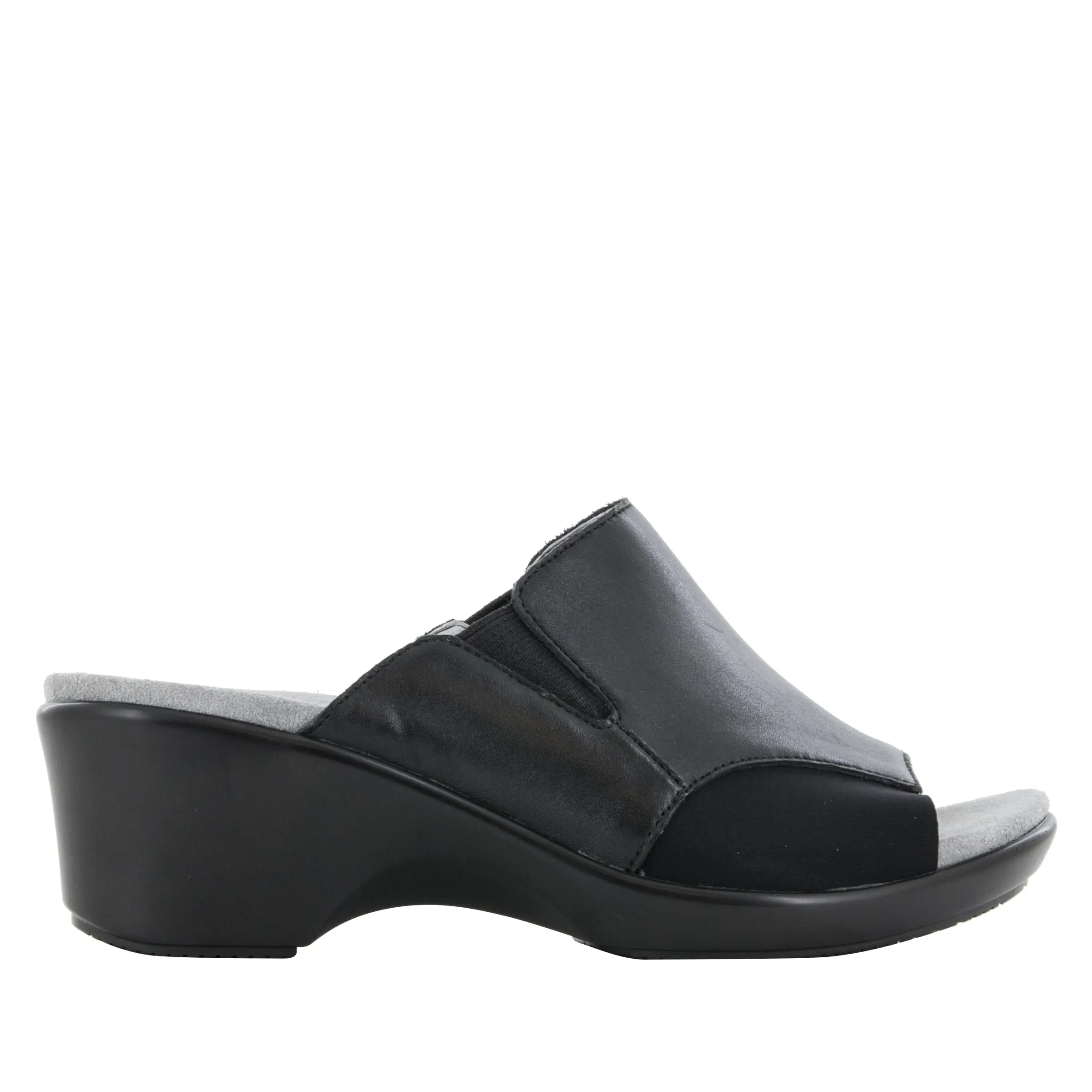 Classic wedge-heel slide style, embedded with open-cell neoprene that provides a soft elastic fit to problem prone areas. Always timeless this Ryli is featured in Black Nappa leather upper.