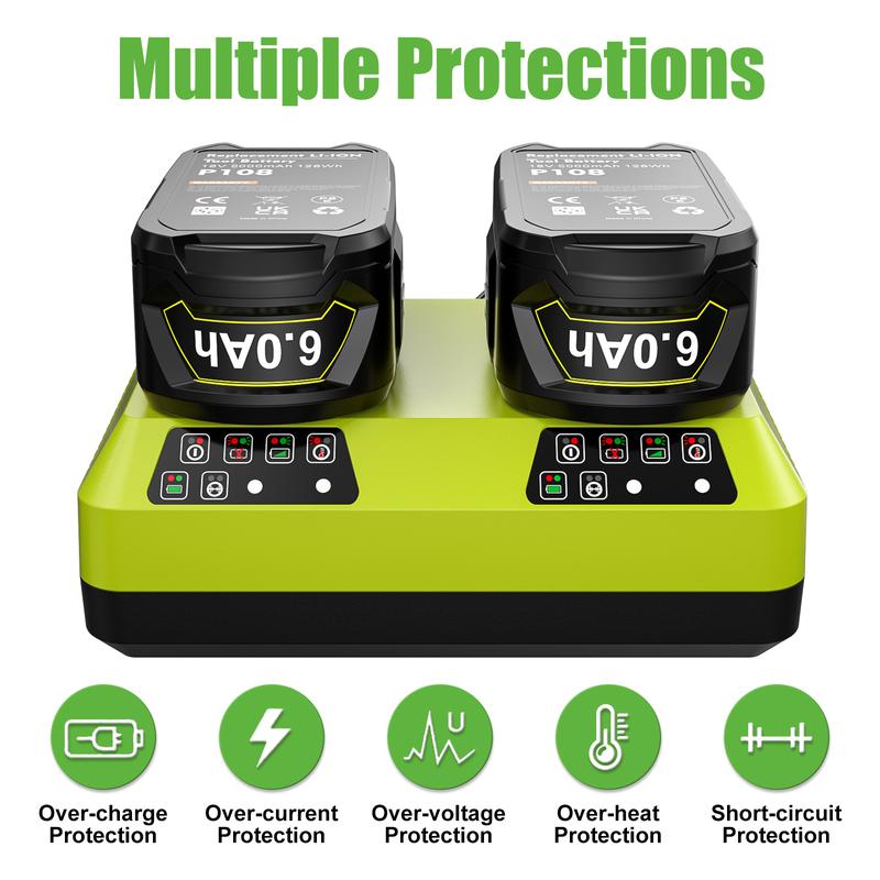 ✅【Packgae Include】2x 7000mAh 18V Replacement Ryobi 18V Lithium Battery, 1x 2Port P117 Dual Chemistry 18V Battery Charger for Ryobi 18V Battery ONE+ P117 P118. This replacement ryobi charger can simultaneously charge 2Pack 12-18V ryobi batteries.