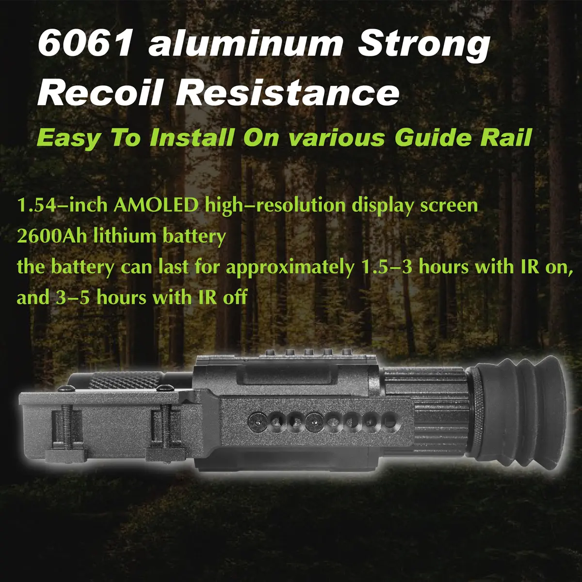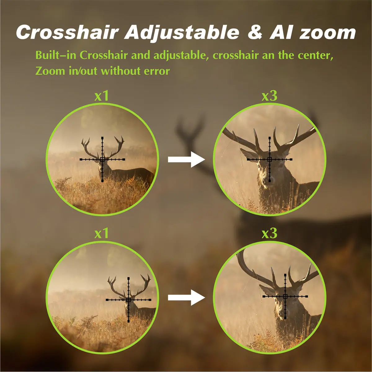 ·【Fixed 3x magnification】:Equipped with a central focusing wheel for rapid adjustment according to individual visual needs. It features a built-in 1.54-inch circular full-view screen, ensuring fine detail imaging even when observing distant objects. The screen comes with adjustable crosshairs, offering 6 selectable modes for the crosshair cursor, with color switching options and support for shutdown memory mode.