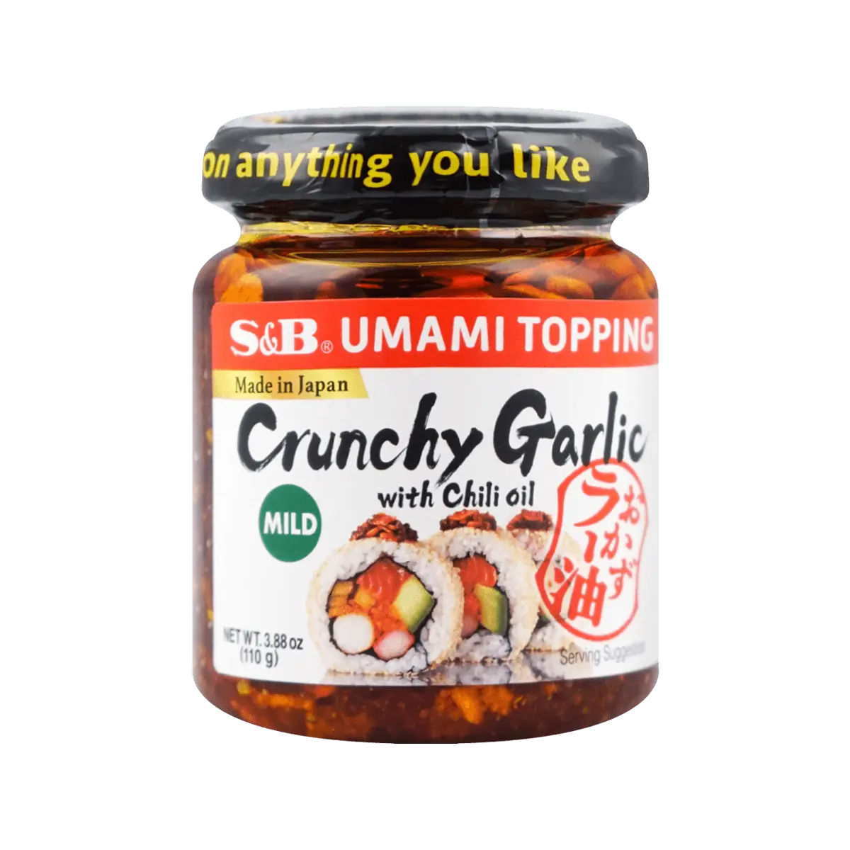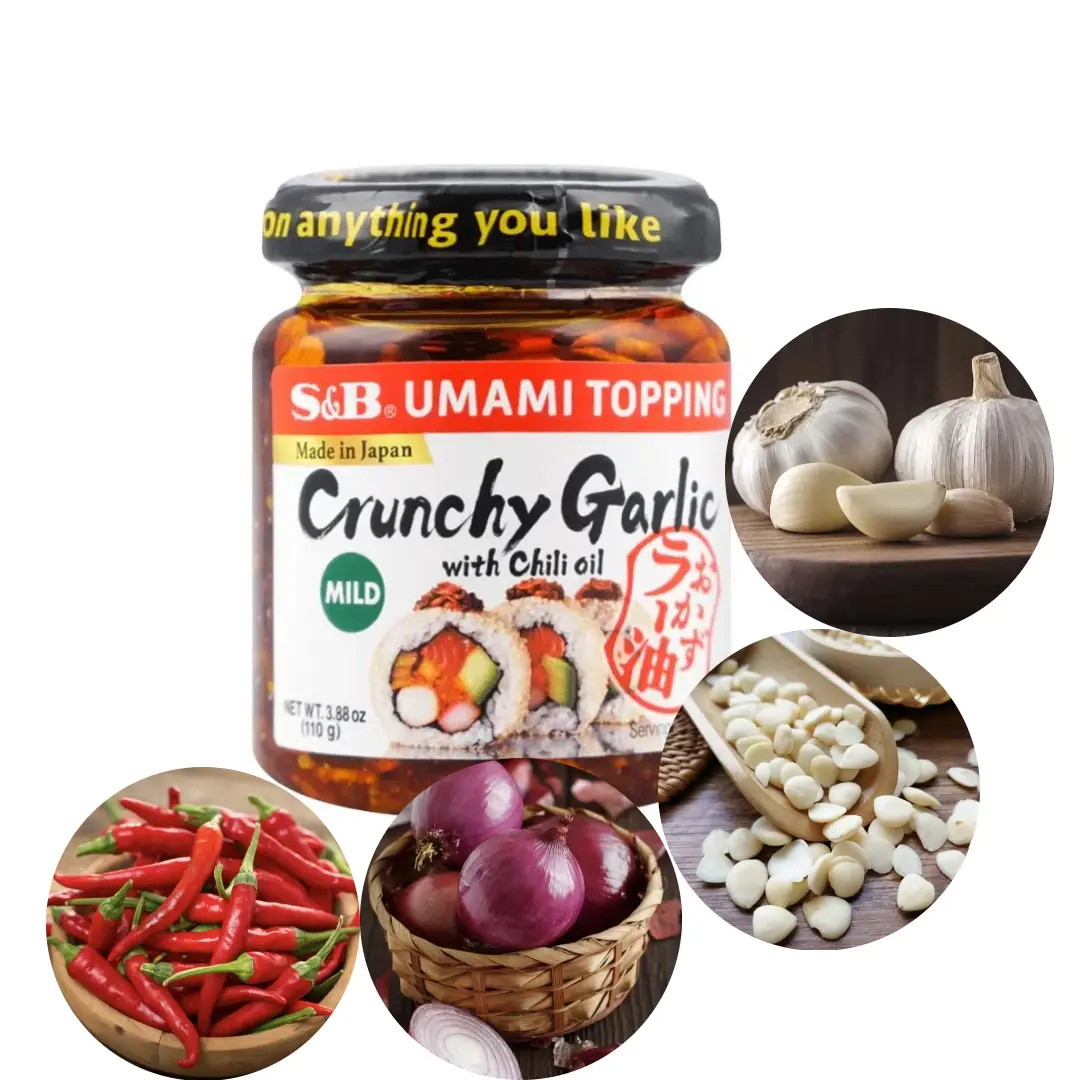 ·Corn Oil, Chili Pepper, Fried Garlic, Sesame Oil, Monosodium Glutamate, Onion Powder, Salt, Sugar, Soy Sauce Powder (Soybean, Wheat Flour, Salt), Chili Paste (Chili Pepper, Salt, Rice), Almonde, Fried Onion, Ground Sesame Seeds, Disodium Guanylate, Disodium Inosinate, Mixed Tocopherols.