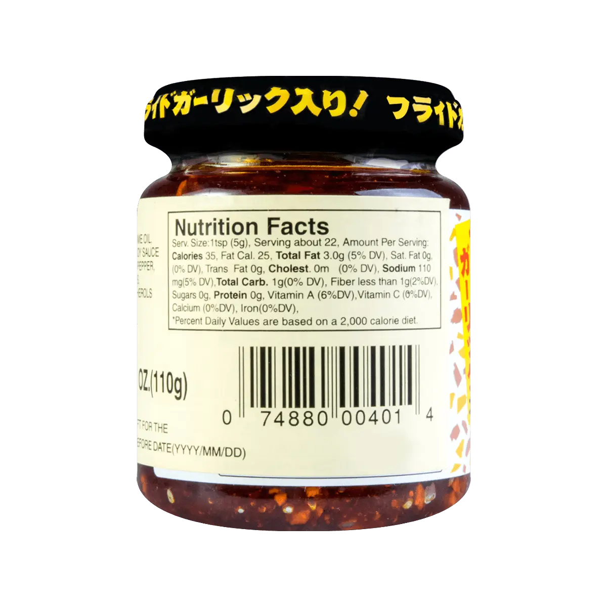 ·Corn Oil, Chili Pepper, Fried Garlic, Sesame Oil, Monosodium Glutamate, Onion Powder, Salt, Sugar, Soy Sauce Powder (Soybean, Wheat Flour, Salt), Chili Paste (Chili Pepper, Salt, Rice), Almonde, Fried Onion, Ground Sesame Seeds, Disodium Guanylate, Disodium Inosinate, Mixed Tocopherols.