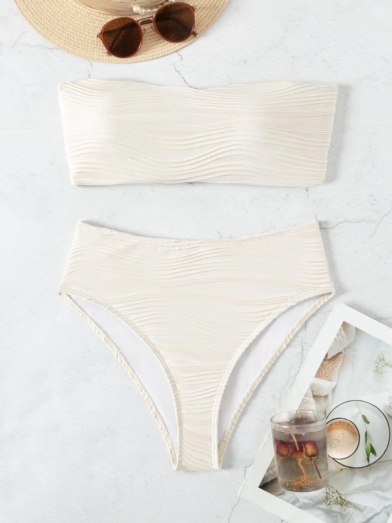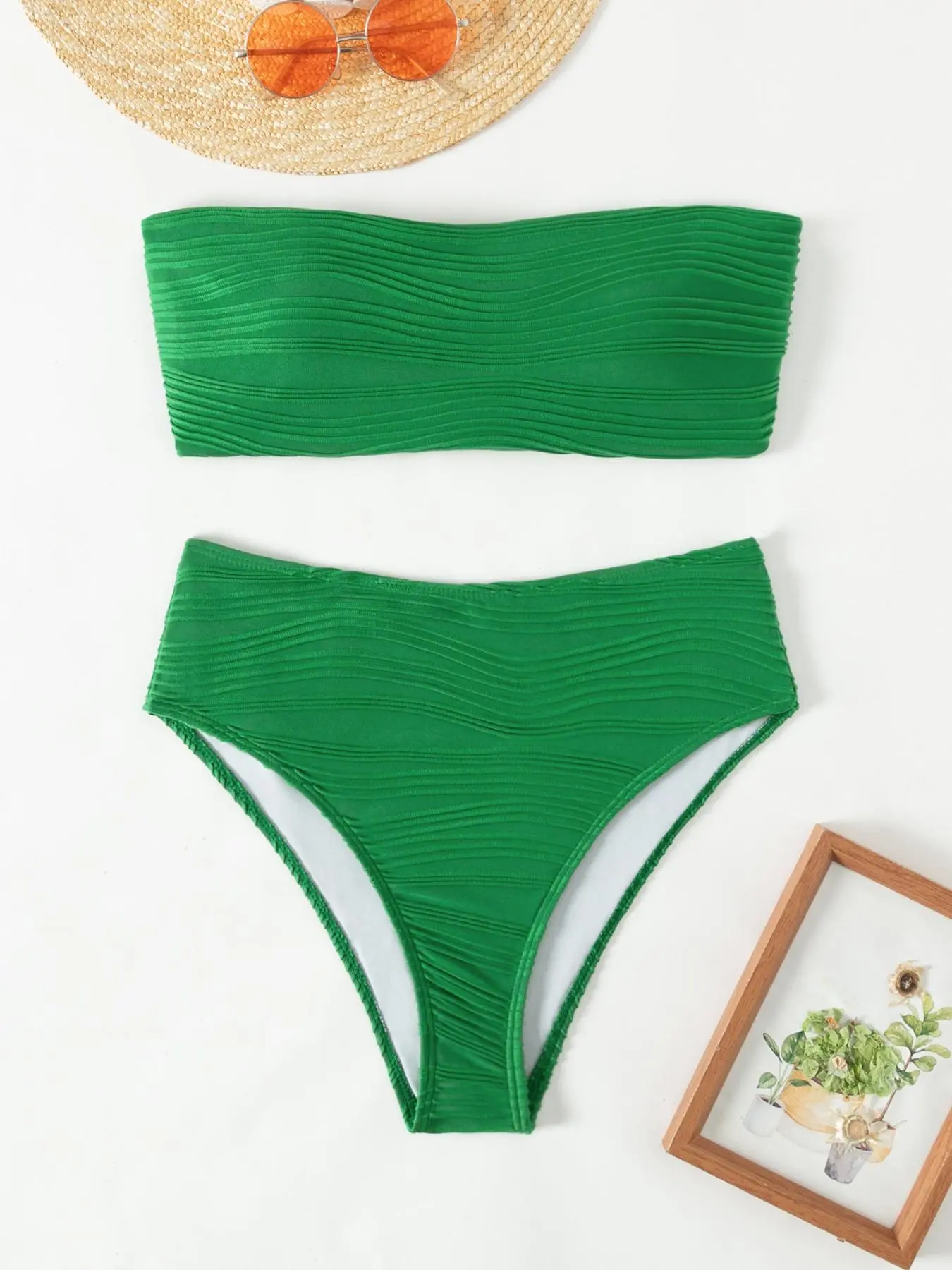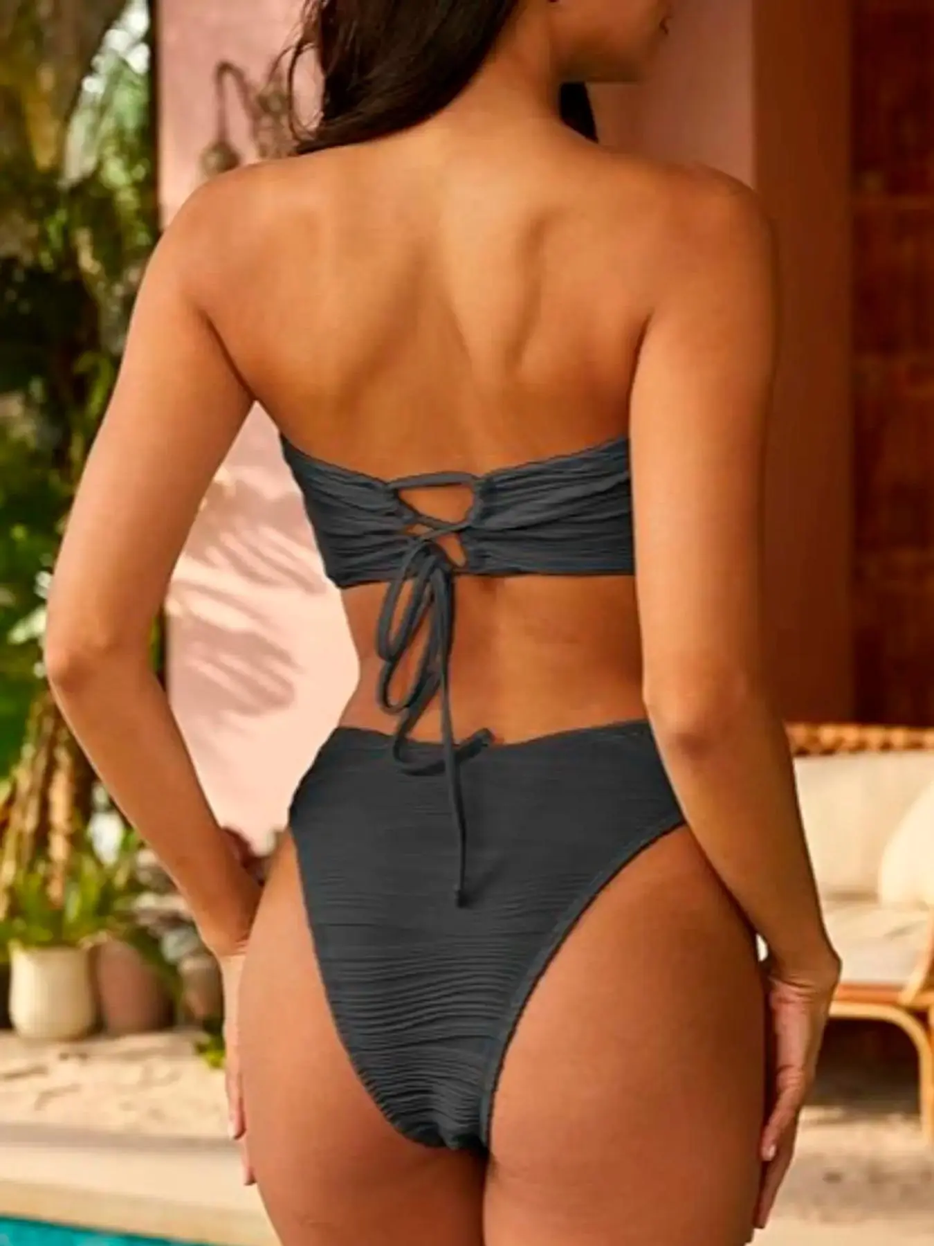 The top is cute and I like the texture and that you can tie it since there’s no straps, the bottoms are good for coverage but not really tanning and they’re not very flattering.