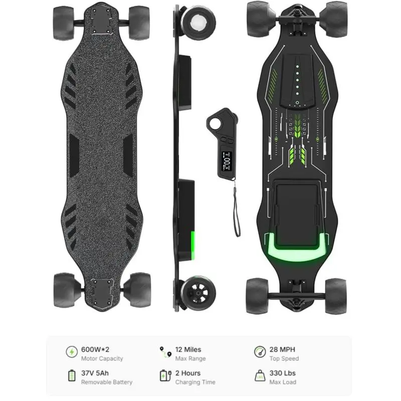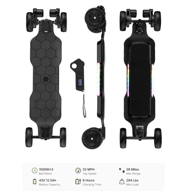 The S10 electric skateboard propels riders to speeds up to 32 mph (52 km/h). The powerful 3000W motor ensures rapid acceleration, going from 0 to 32 mph in seconds. Four modes are available for adjustment. Perfect for adrenaline junkies and serious commuters, this skateboard is not just for casual cruising.