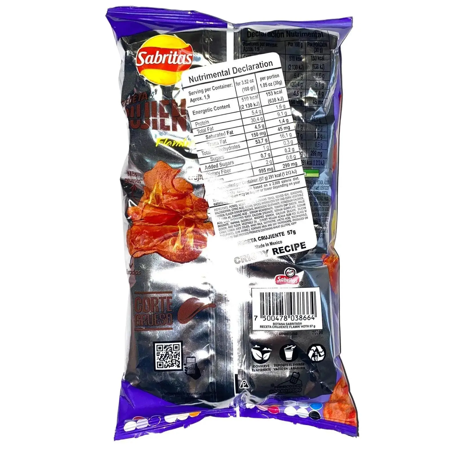 | Ingredients | Potato, vegetable oll, seasoning [lodized salt, maltodextrin, citric acid, sugar, flavorings (contains milk and wheat Ingredients), spices, MSG, hydrolyzed CEITE VEGEN vegetable protein, fumaric acid, allura red AC, yeast hydrolyzate, tomato powder, malic acid, chili peppers, paprika oleoresin partially hydrogenated soybean oll, sodium Inosinate, cheese mix, sodium guanylate, rice flour, sunset yellow FCF, class IV caramel, gum arabic, modified starch, sodlum caseinate, cream, chill extract, skim milk, lemon juice sollds, milk solids, TAM tartrazine). |