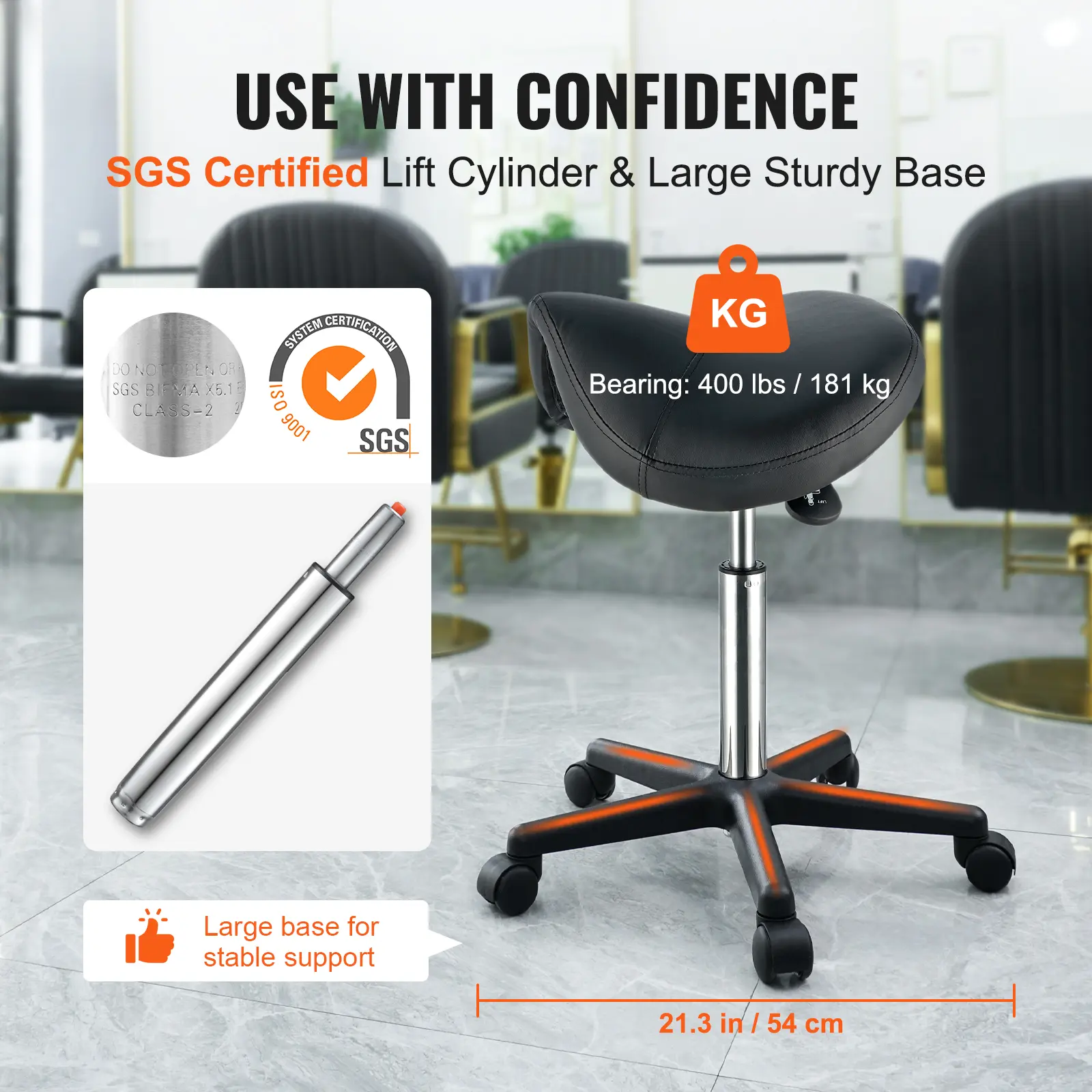 • Sturdy Structure: The swivel saddle stool base has been widened to 21.3 inches, ensuring not only a greater weight capacity of 400 lbs but also a solid foundation for all your seating requirements. Rest assured, our lift cylinder is SGS certified, allowing you to enjoy your seating experience with absolute confidence.