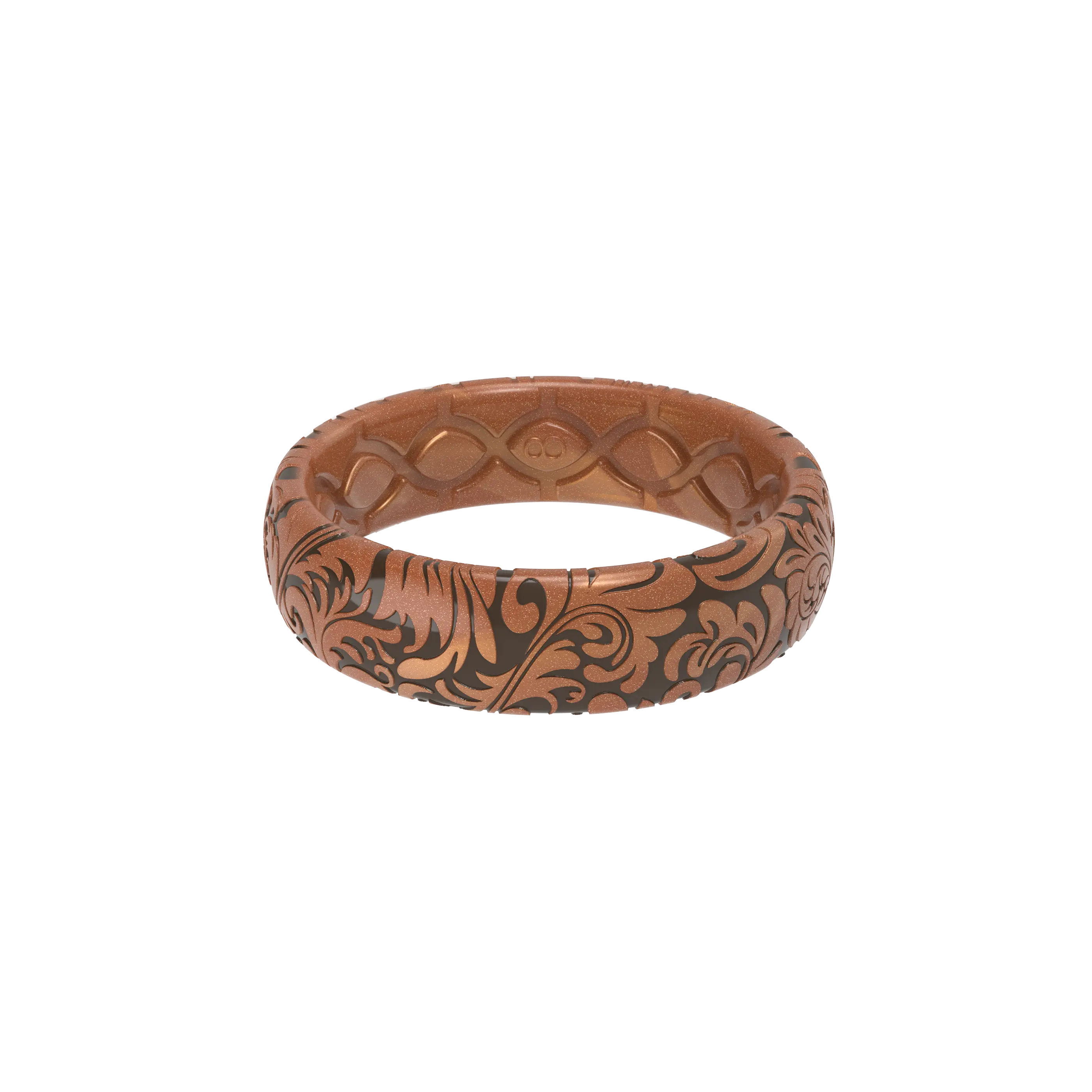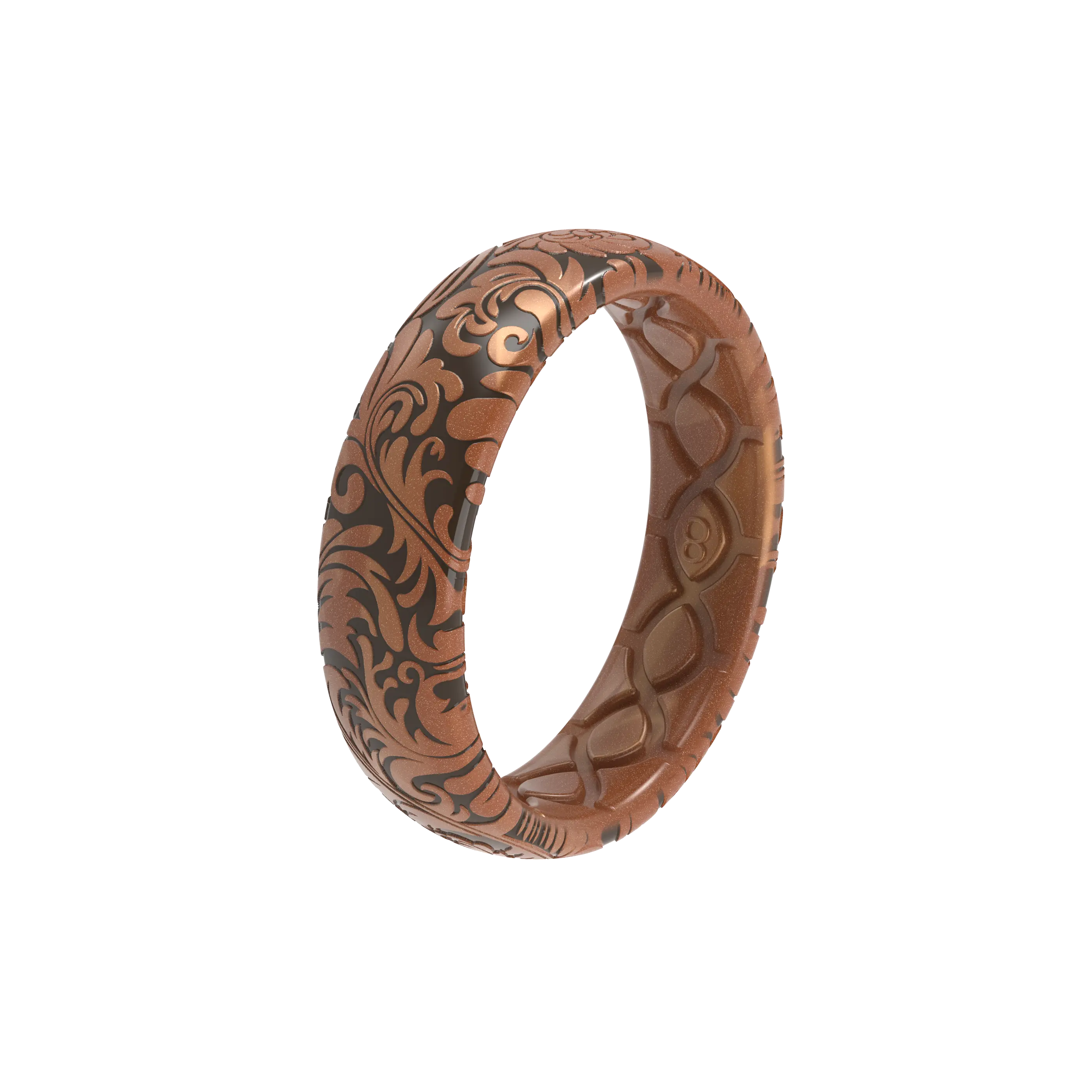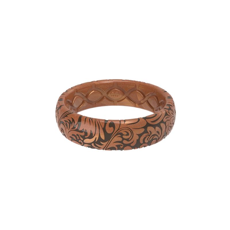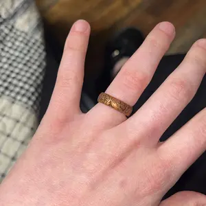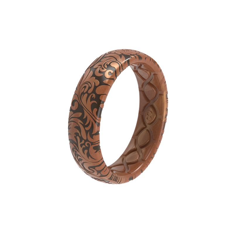 Very comfortable and true to size, I sometimes forget that I'm wearing it, which is great with my hands-on outdoor work! The design is lovely -- shinier than expected from the low-light promo pic that I saw, but I really enjoy the tooled leather design. Very pretty and unique among the other silicone ring options I've seen. Adding a couple of pics to show appearance in lower vs. brighter lighting. Very happy with this ring, thank you!
