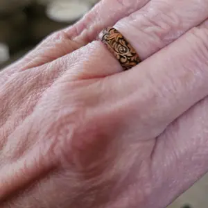 Just recently started following her on FB. Love her posts… This ring represents a beautiful tooled leather look! I love most all thing’s western. The fit & delivery were both perfect.