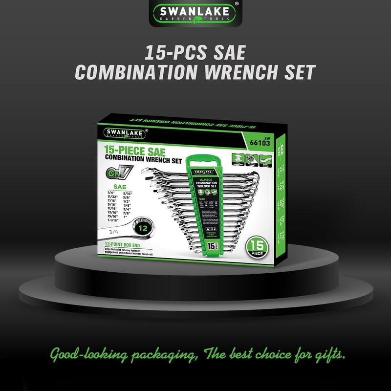 This 15-piece SAE wrench set is made from high-strength chrome-vanadium steel for maximum durability. The mirror finish enhances corrosion resistance, extending the tools' lifespan. The unique V-Notch design ensures a strong grip on fasteners, providing increased torque and reducing wear on fasteners.