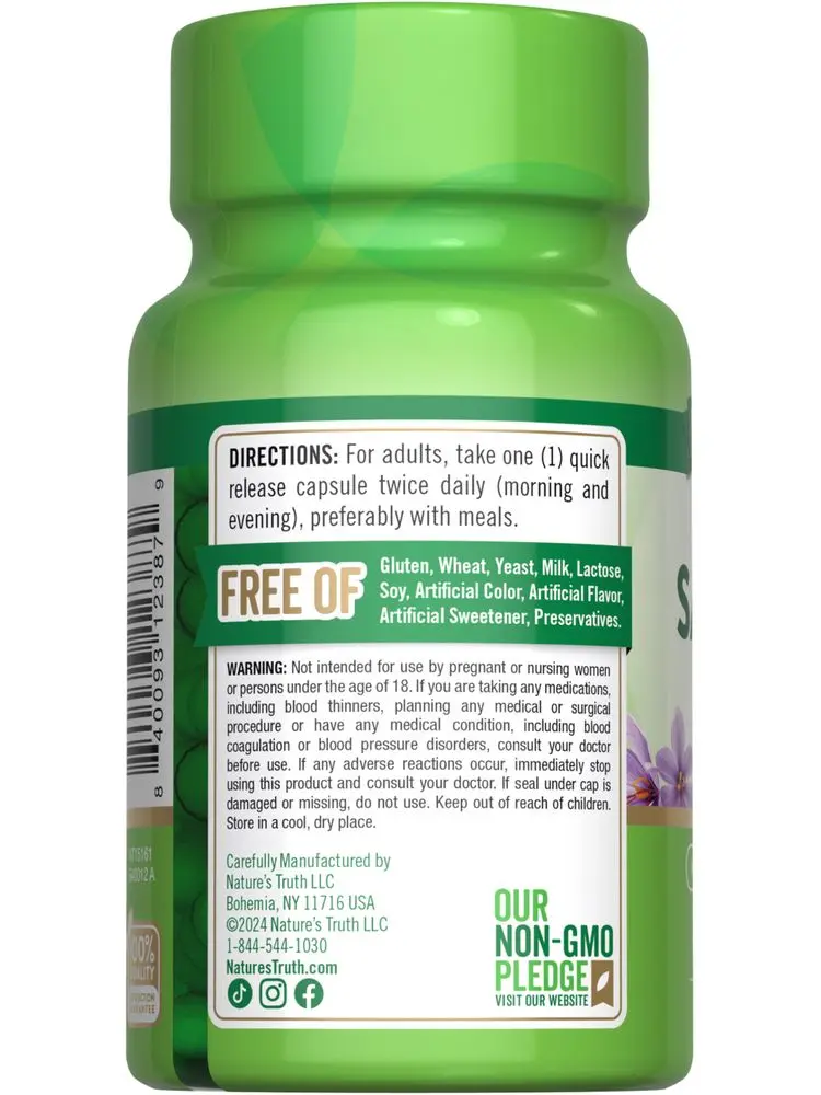 Our mission at Nature’s Truth is to meet your wellness needs with products that go above and beyond. Nature’s Truth provides supplements in various delivery forms to suit every preference. Our Saffron is non-GMO and free of gluten, wheat, yeast, milk, lactose, soy, artificial color, artificial flavor, artificial sweetener, and preservatives.