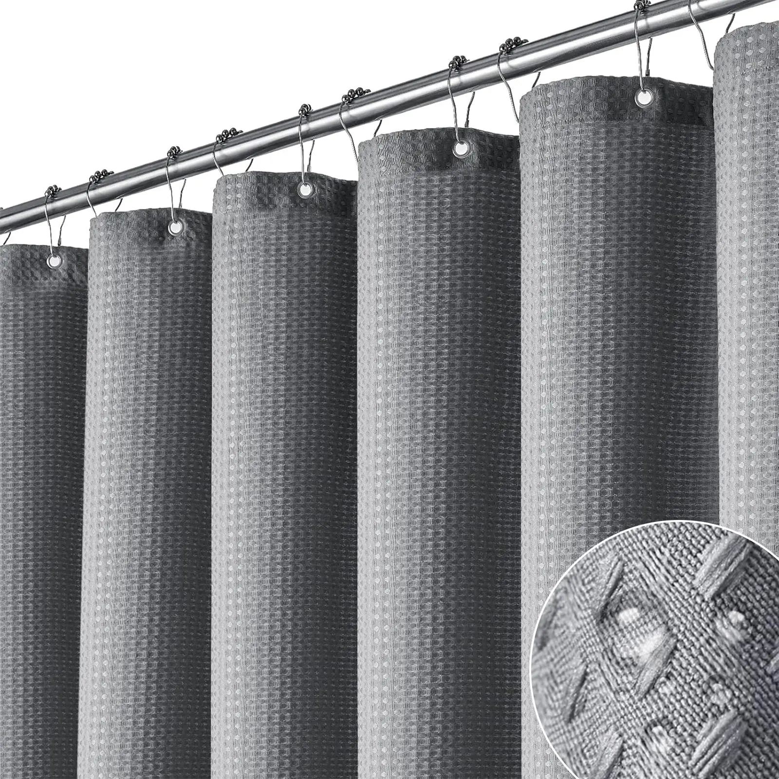 【Elegant & Modern Style】 This waffle shower curtain will complement any bathroom - use at home, apartment, condo, hotel, camper, RV, dorm, school shower, college dorm room, athletic club, gym and everywhere else you need a reliable shower curtain. Cloth fabric, machine washable and easy care.