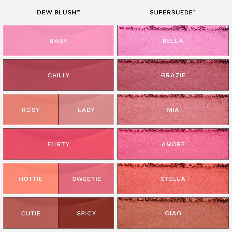 Build and stack bestselling Dew Blush with luxuriously plush SuperSuede Blush for an intensified flush of color with a dimensional finish. Start with a dot of Dew Blush per cheek, let it set, then stack SuperSuede on top to intensify color and set the look.