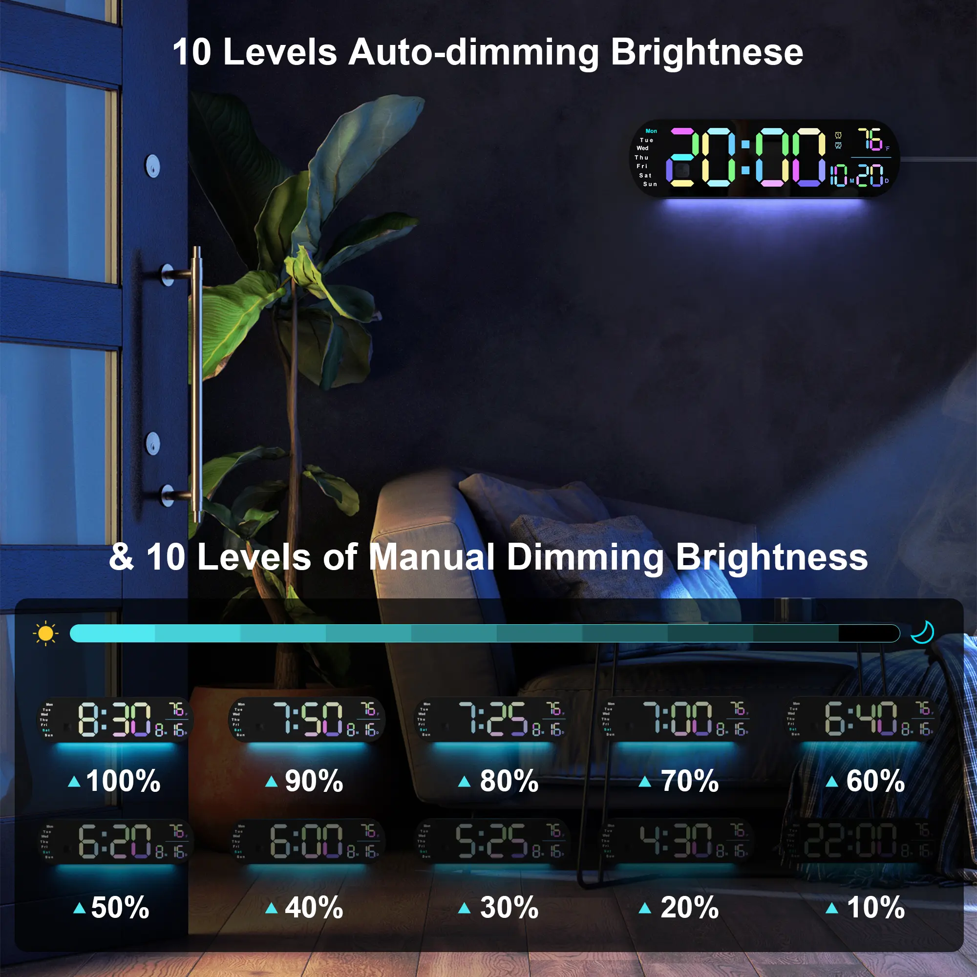 [AUTO/ADJUSTABLE BRIGHTNESS]: The large digital wall clock with auto brightness feature ensures optimal visibility at any time of day. It offers 10 levels of brightness adjustment, allowing you to customize your viewing experience for maximum comfort. This wall clock is designed to provide flicker-free lighting, ensuring a gentle experience. If you desire a completely dark sleeping environment, you have the option to deactivate the screen.