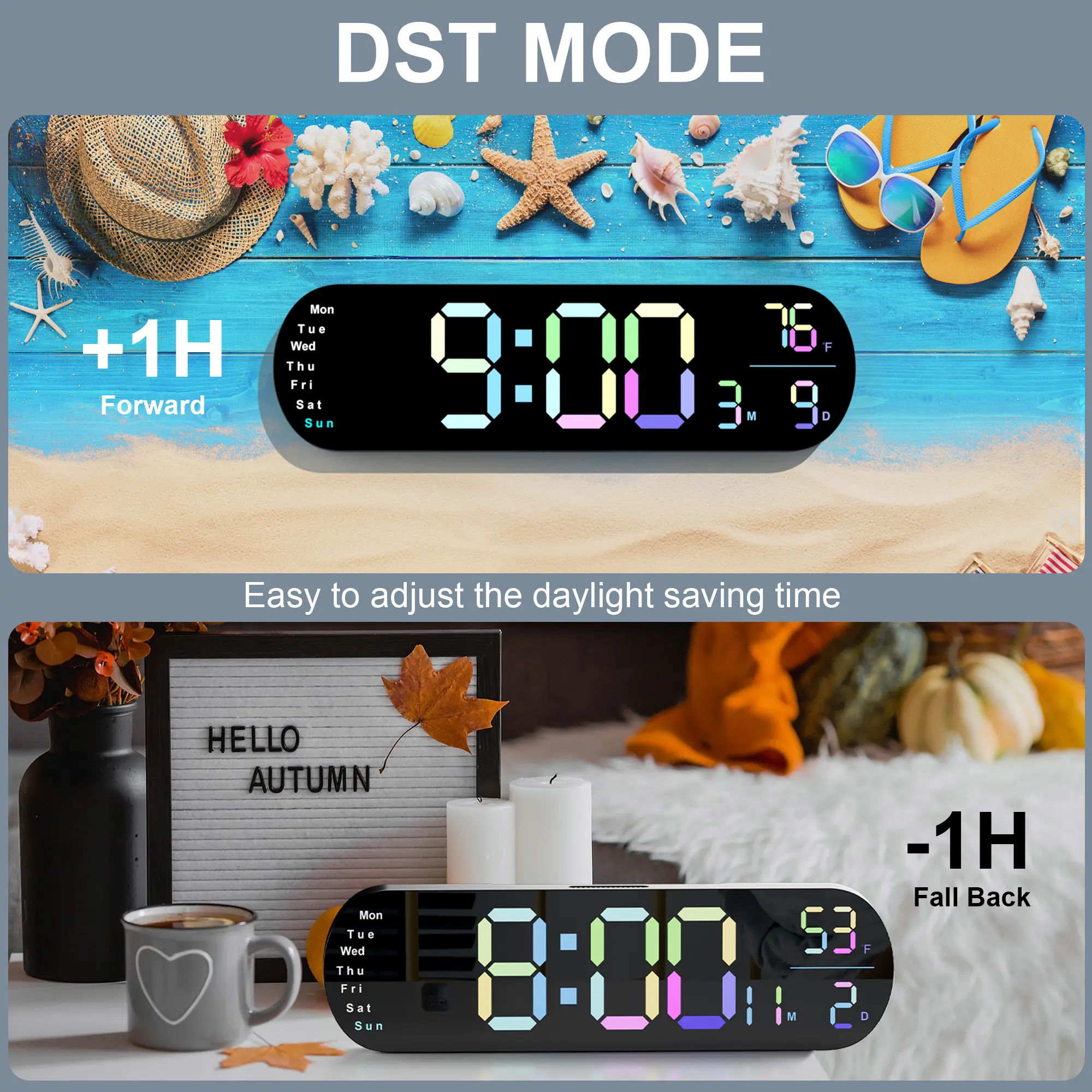 [13.7 " Large Display Digital Clock]: The Digital Wall Clock has a large screen that displays the time, date, week, daylight saving time, and temperature all at once. It offers a seamless and pleasant visual experience, allowing you to easily see important information at a glance. It is user-friendly with simple time and alarm clock settings. It is suitable for children, older adults, and people with visual impairments.