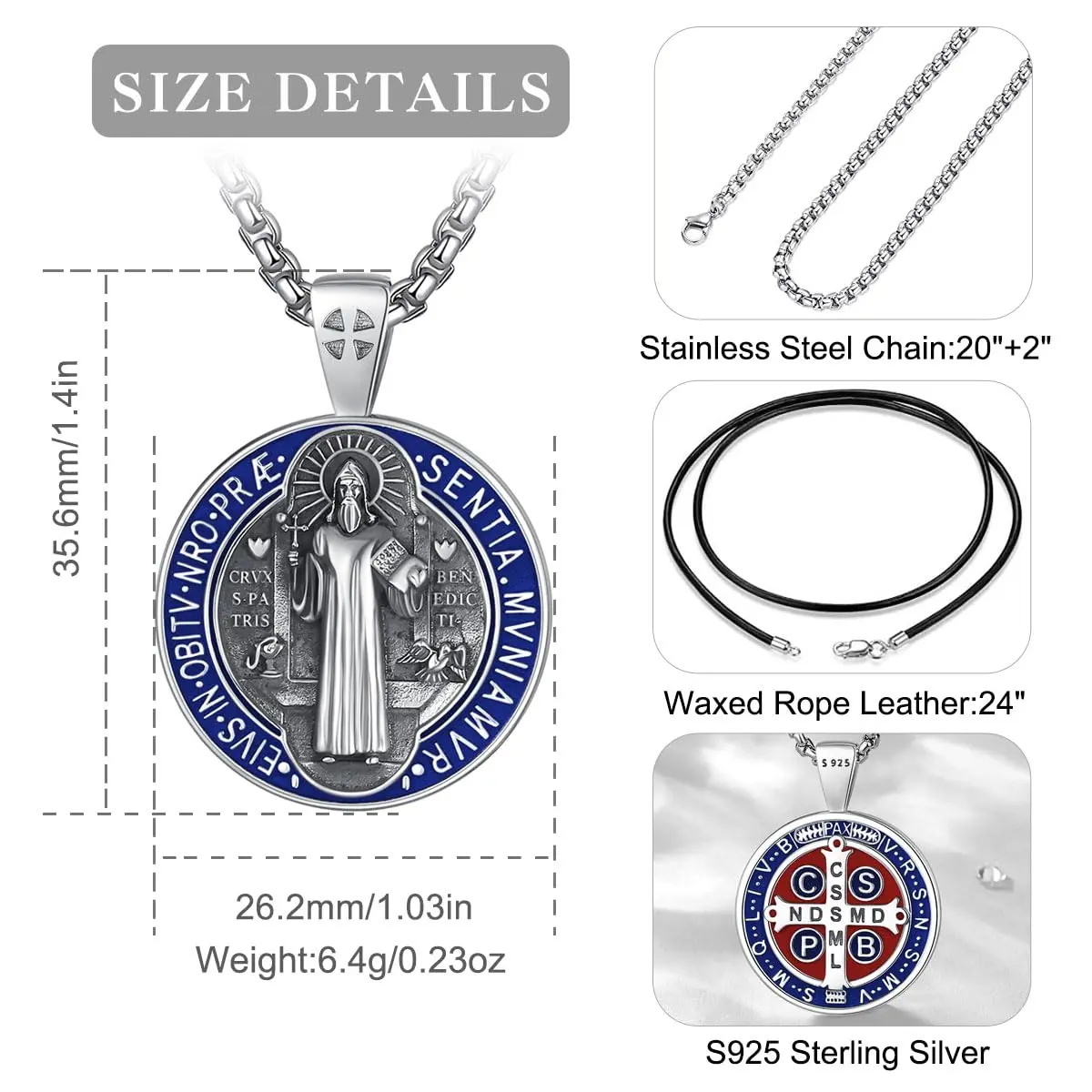 FEATURE: The St Benedict medal necklace size: 26.2 * 35.6 mm / 1.03 * 1.40 inch.The pendant Weight: 6.4 g / 0.23 oz.Match two different styles of chains.Wax Leather Cord Chain Length: 24 inch.Stainless steel chain: 22 inch+2 inch.