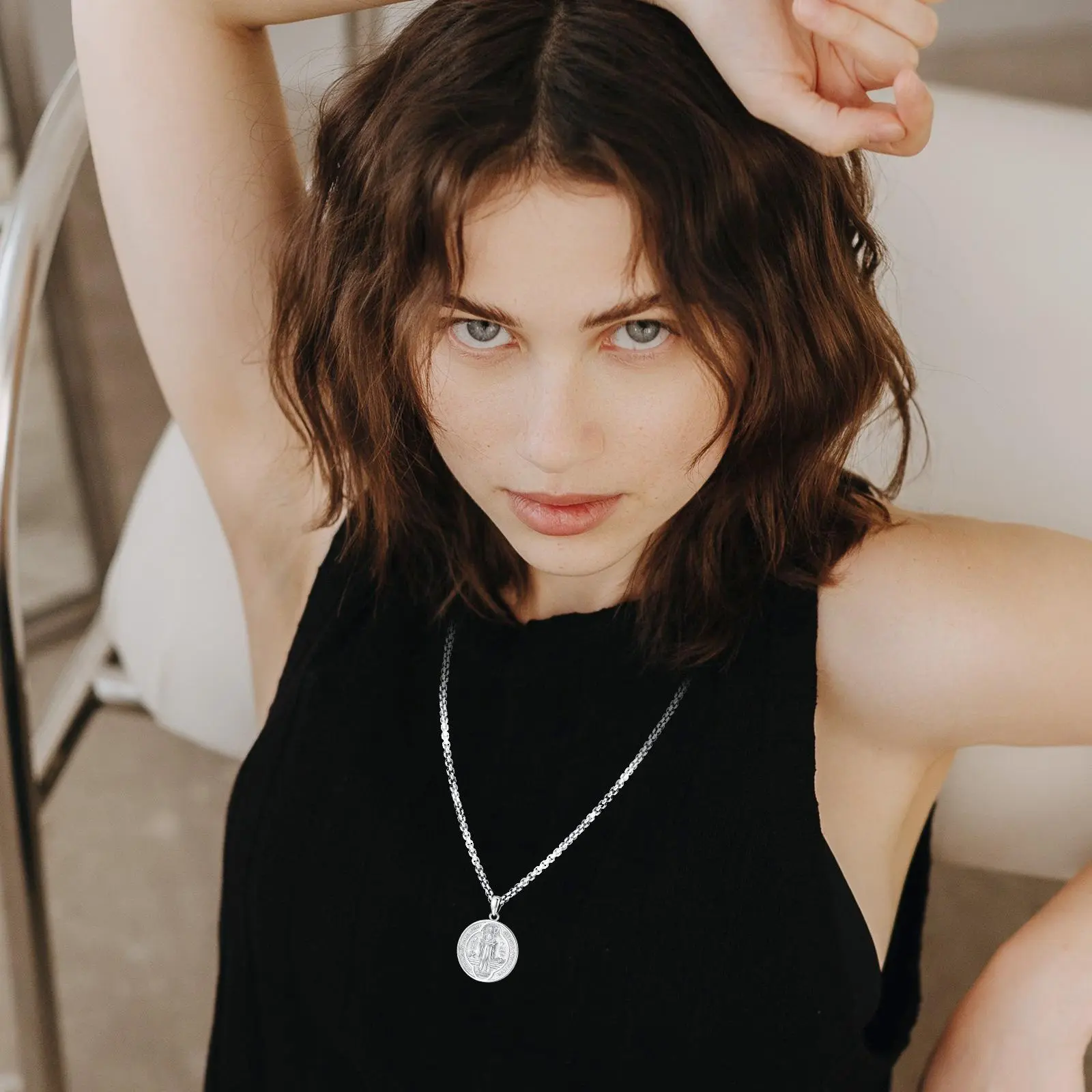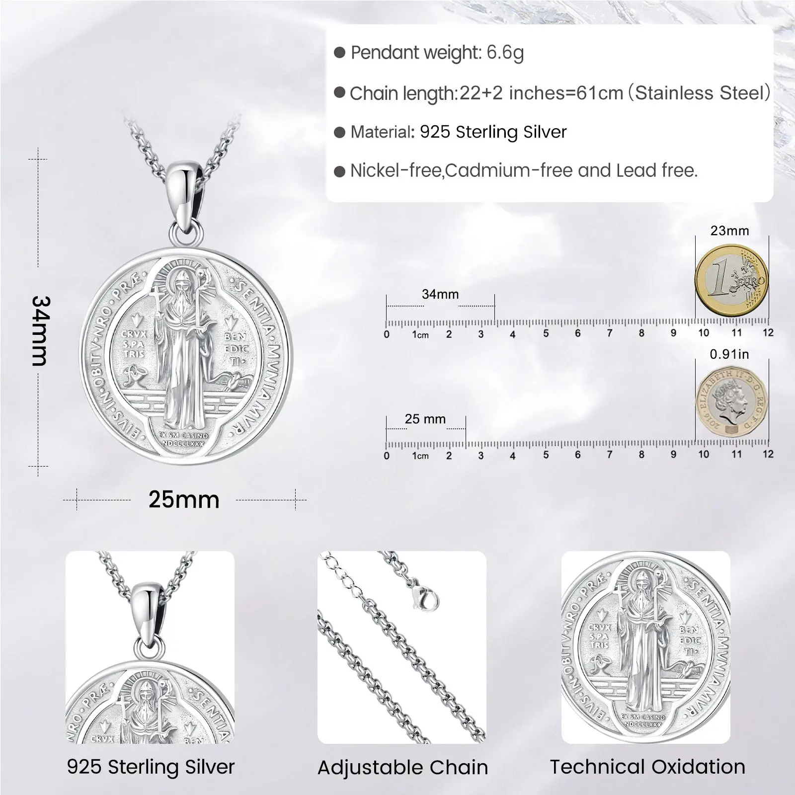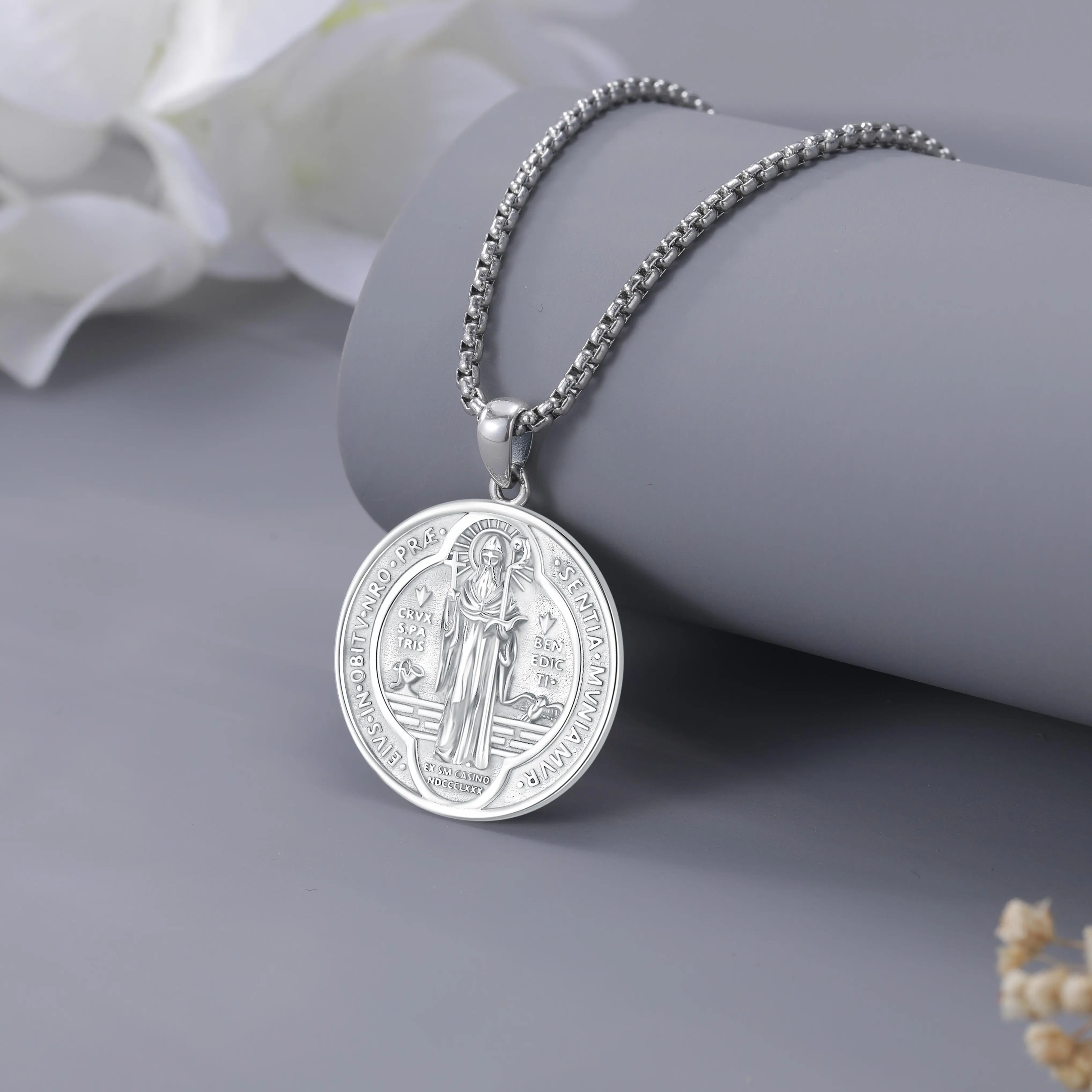 DRINSPER San Benito plata 925 colgante collar, Saint Benedict Pendant Necklace, 925 Sterling Silver, Vintage St Benedict Medal, Christians Belief Religious Jewelry Gift for Men Women