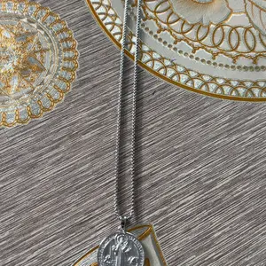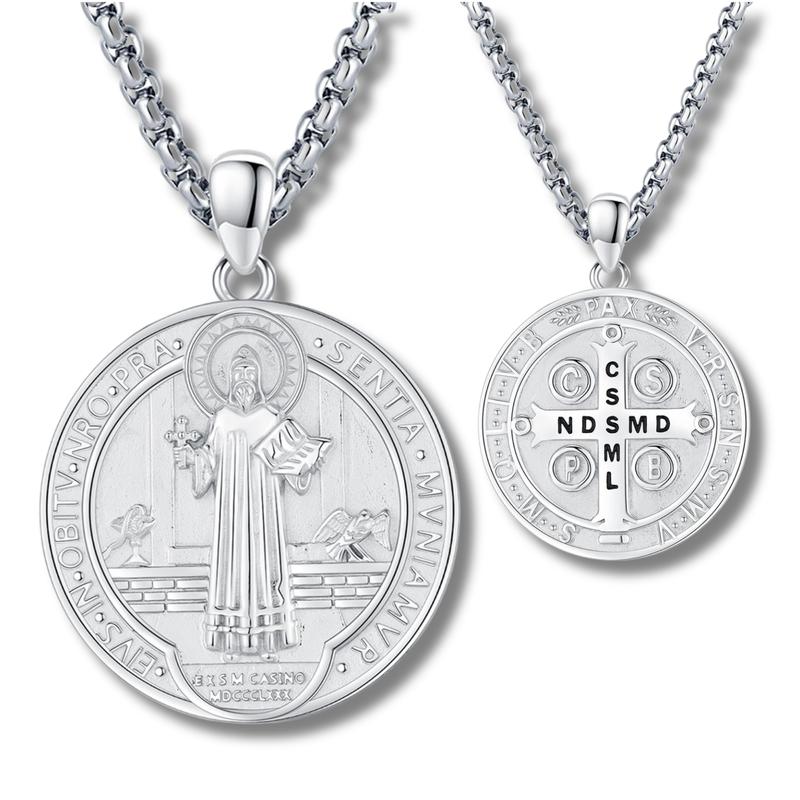 This pendant is inspired by the Saint Benedict Medal, blending traditional religious symbolism with modern design. The front features an image of Saint Benedict holding a crucifix and a book, symbolizing faith and spiritual defense. The back displays a cross with Latin prayer abbreviations, believed to offer protection from evil. The silver design highlights the pendant's sacred meaning, making it both a symbol of faith and a stylish accessory.