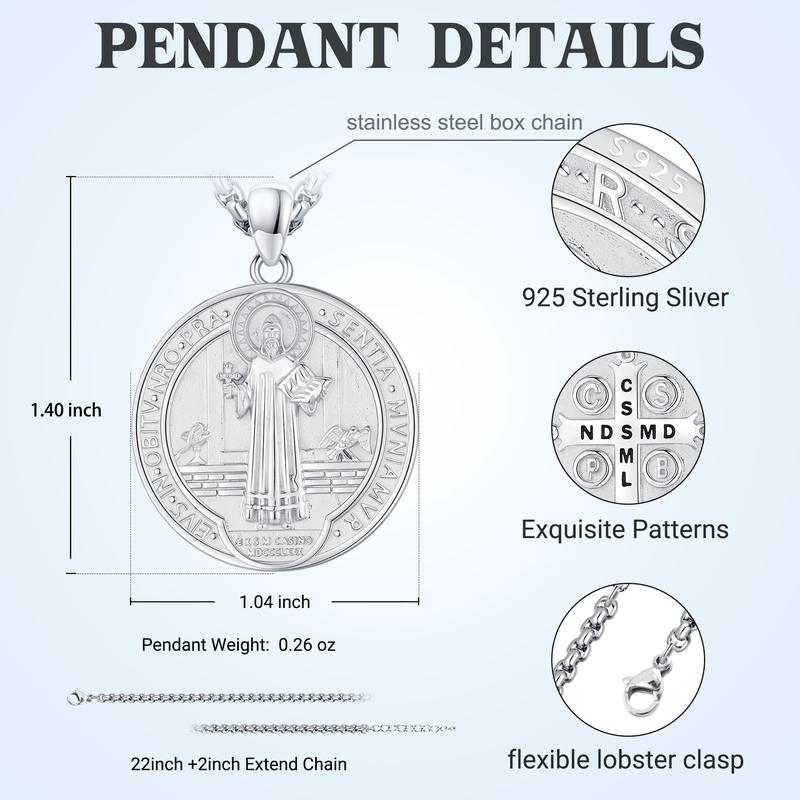 DRINSPER Collar de Plata 925 de San Benito, Saint Benedict Protection Necklace, Latin Inscription in Cross with Religious Symbolism, Prayer Abbreviations (CSSML, NDSMD)