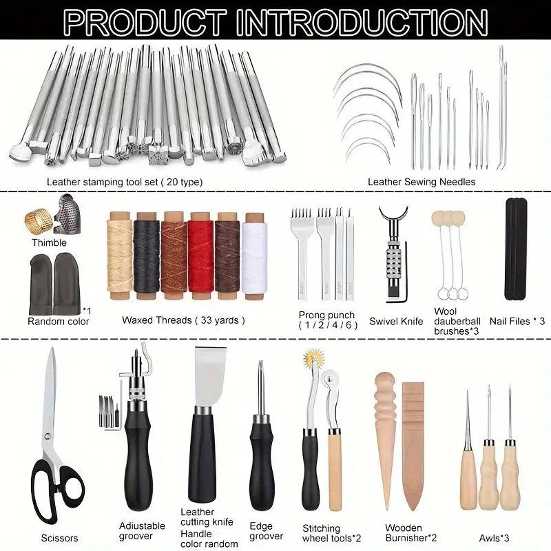 Leather sewing and carving set: The set includes an awl, stitching punches, adjustable groover, sewing tracing wheel, thimble, scissors, wax thread, and various leather sewing needles. Additionally, it features a wool dauber, 20 leather stamping tools, a swivel knife, edge beveling skiving cutting tool, wooden burnishers, and more to meet your leather sewing and DIY carving needs. It is very easy to use and comes with instructions for reference.