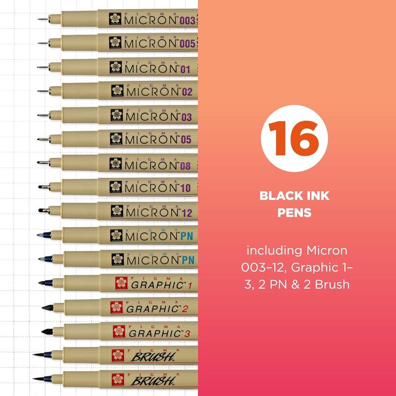 ·Assorted Micron Pen Point Sizes: Contains 1 each of 003, 005, 01, 02, 03, 05, 08, 10, 12; 2 plastic nib, 2 Brush, and Graphic 1-3