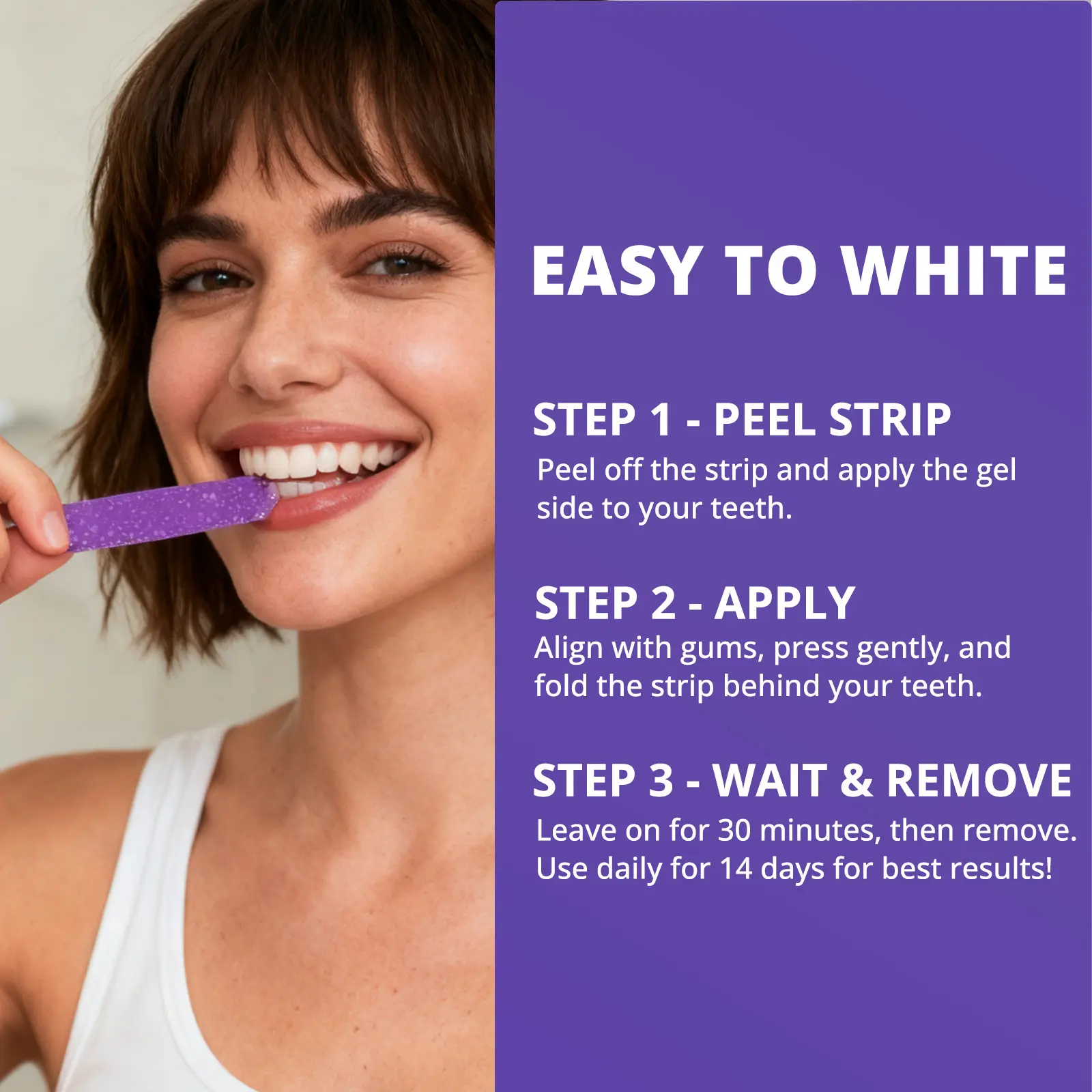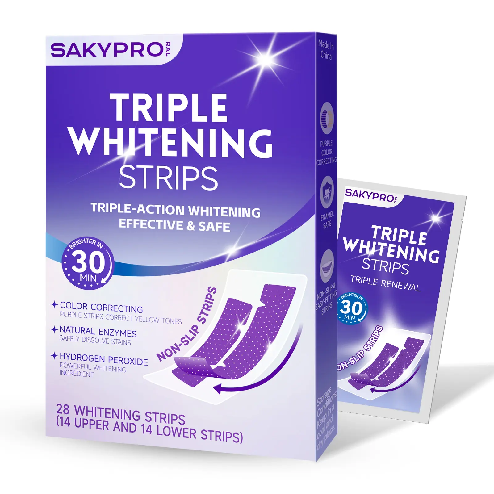 ·SAFE, COMFORTABLE & COMPLETE WHITENING KIT: Gentle on enamel yet powerful on stains, our triple-action formula combines color correction, hydrogen peroxide, and papain enzyme for a visibly brighter smile that lasts. Each kit includes 28 strips (14 upper + 14 lower) for a complete 14-day whitening routine.