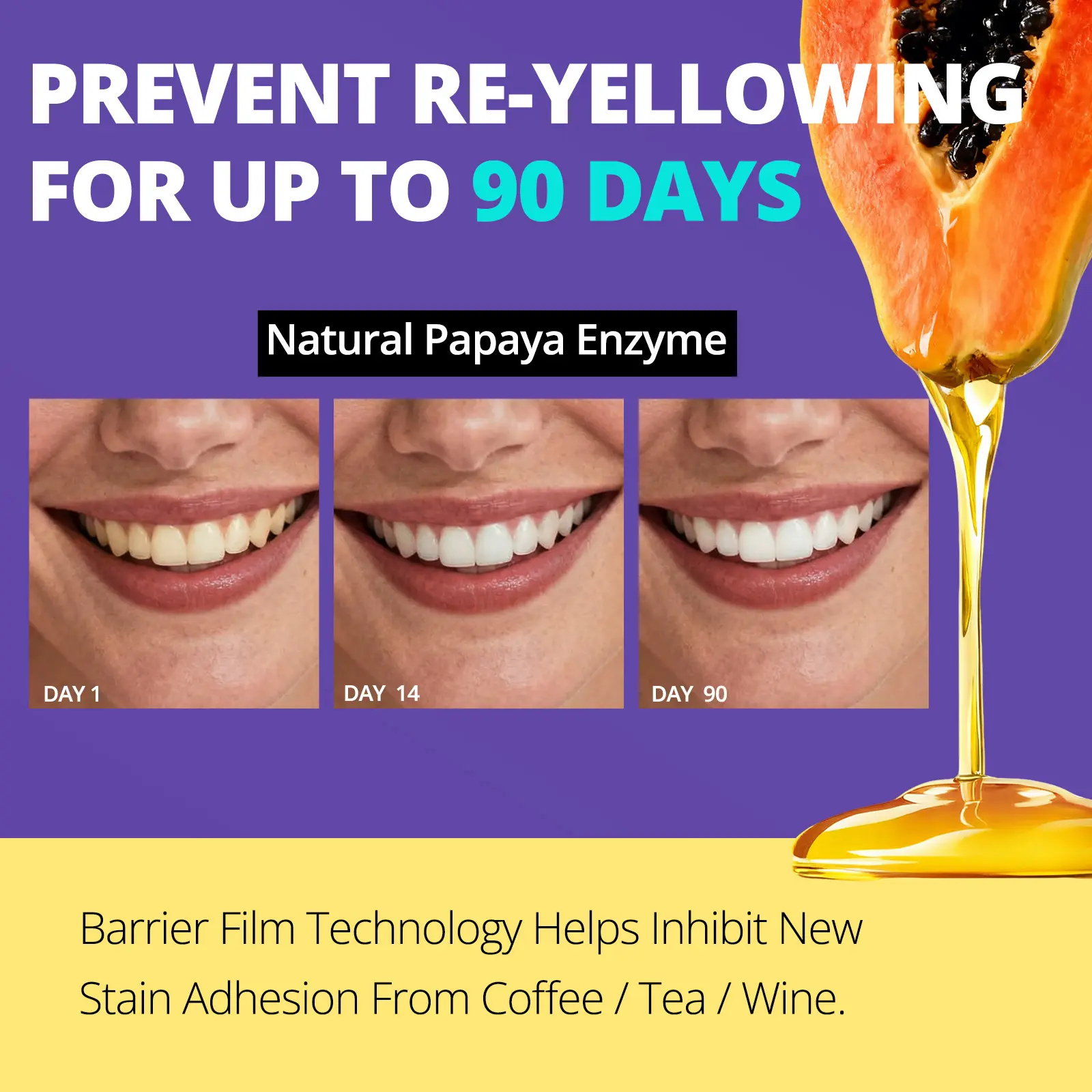 ·PAPAIN ENZYME FOR 90-DAY ANTI-YELLOWING PROTECTION: Powered by Papain, a natural enzyme extracted from papaya, these strips continue working long after each use. Papain gently breaks down new surface stains and prevents color rebound, keeping your teeth naturally bright and glossy for up to 90 days.