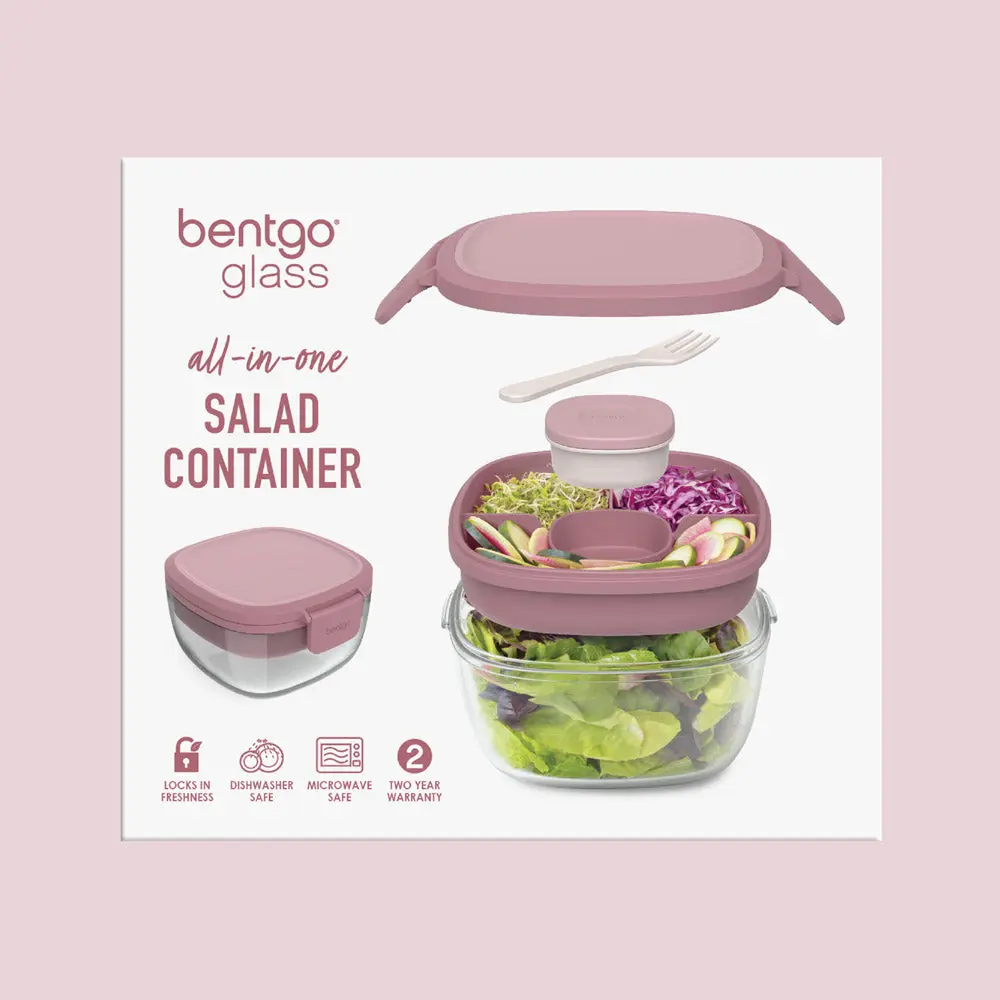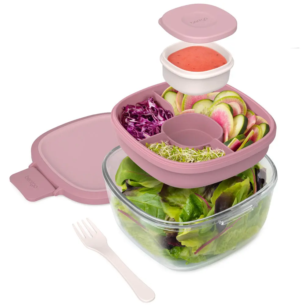 All the components of Bentgo Glass stack conveniently inside the large salad bowl for easy portability while a reusable fork stores under the lid for a complete all-in-one meal.