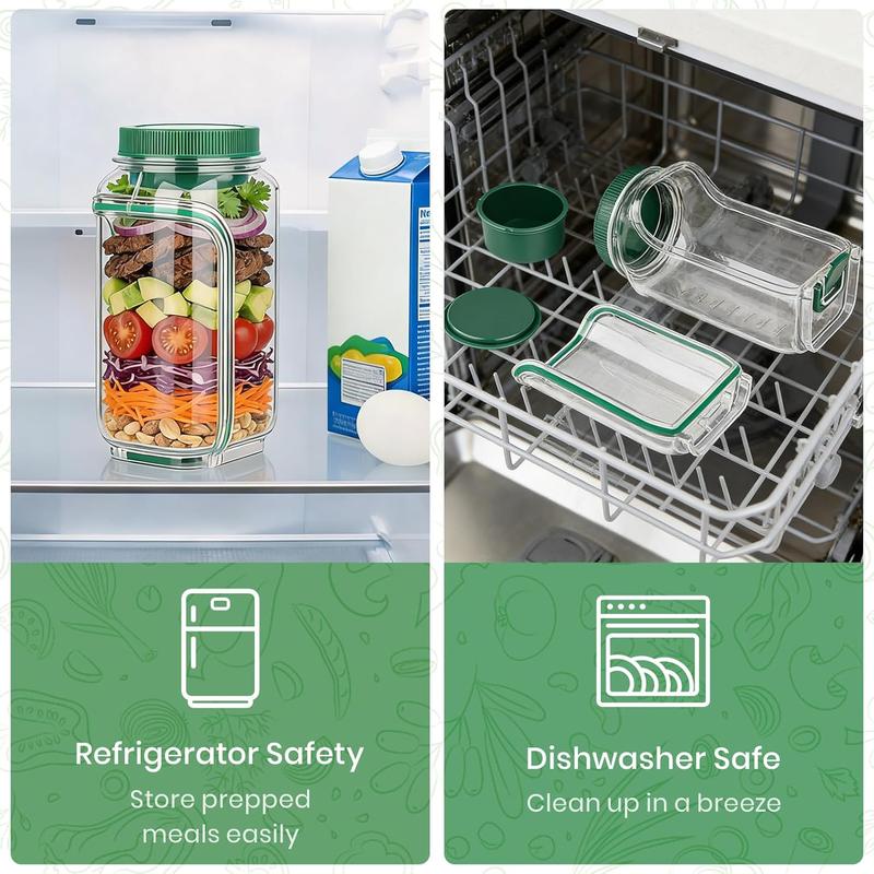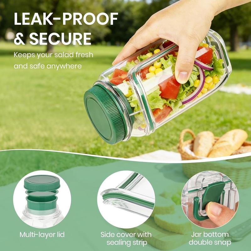 ·Built-In Leakproof Dressing Compartment. Enjoy mess-free meals with the integrated 2.5 oz leakproof dressing container. Keep sauces, dips, and dressings securely separate from your salad until it’s time to mix. Ideal as a salad jars with dressing cup, it prevents spills in your bag and guarantees a fresh, flavorful bite every time.
