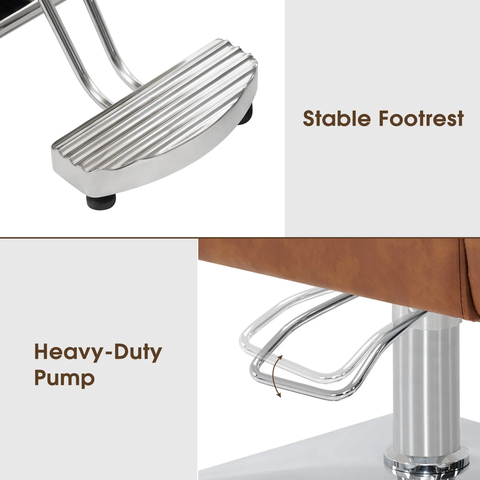 ·High Practicability: High-quality hair salon equipment, T-shape footrest for better stability and appearance. 360° Swivel with locking mechanism provides versatility. Ergonomics construction and high density sponge make customer comfortable. Steel and aluminum frame construction. Heavy-duty hydraulic pump with the max supporting weight of 330 lbs.