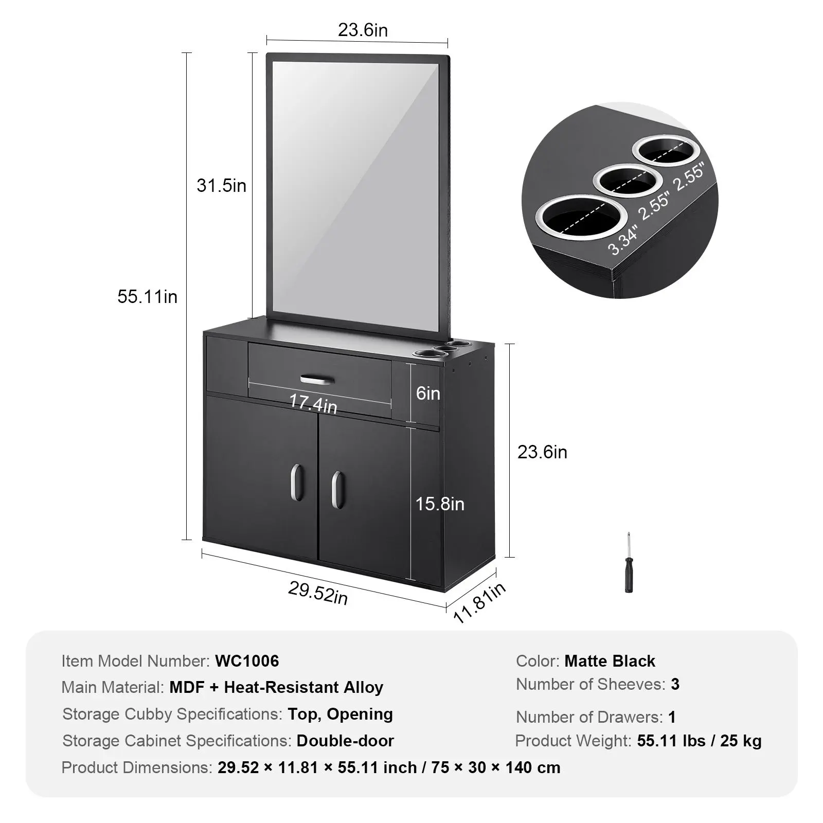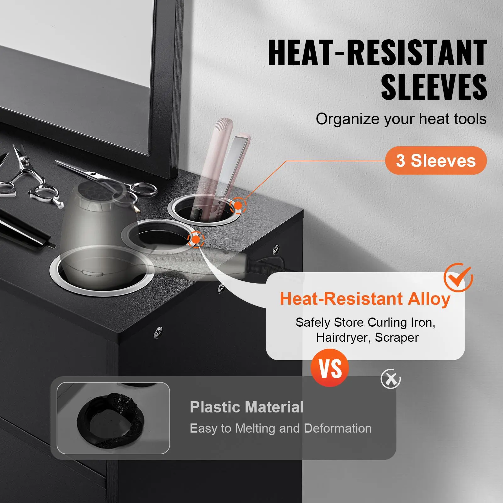 • Heat-Resistant Tool Sleeves: Made of heat-resistant alloy material, the hair styling salon station provides three heat tool sleeves with a bottom cover design to prevent tools from falling, ensuring safety during use.